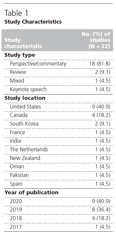 Our search identified 4,299 unique titles, of which 22 full-text articles were included in our final analysis. 8–11,17–34 The majority of these articles were perspective pieces (n = 18, 81.8%), with 3 papers authored or coauthored by the same author, Steven A. Wartman (see Table 1). Other study designs include reviews (n = 2, 9.1%), a case study (n = 1, 4.5%), and a keynote speech (n = 1, 4.5%). While many articles originated from the United States (n = 9, 40.9%), there was a diverse representation of study settings, including Canada (n = 4, 18.2%), South Korea (n = 2, 9.1%), France (n = 1, 4.5%), India (n = 1, 4.5%), the Netherlands (n = 1, 4.5%), New Zealand (n = 1, 4.5%), Oman (n = 1, 4.5%), Pakistan (n = 1, 4.5%), and Spain (n = 1, 4.5%) (see Table 1). Here we present the key themes derived from our scoping review.