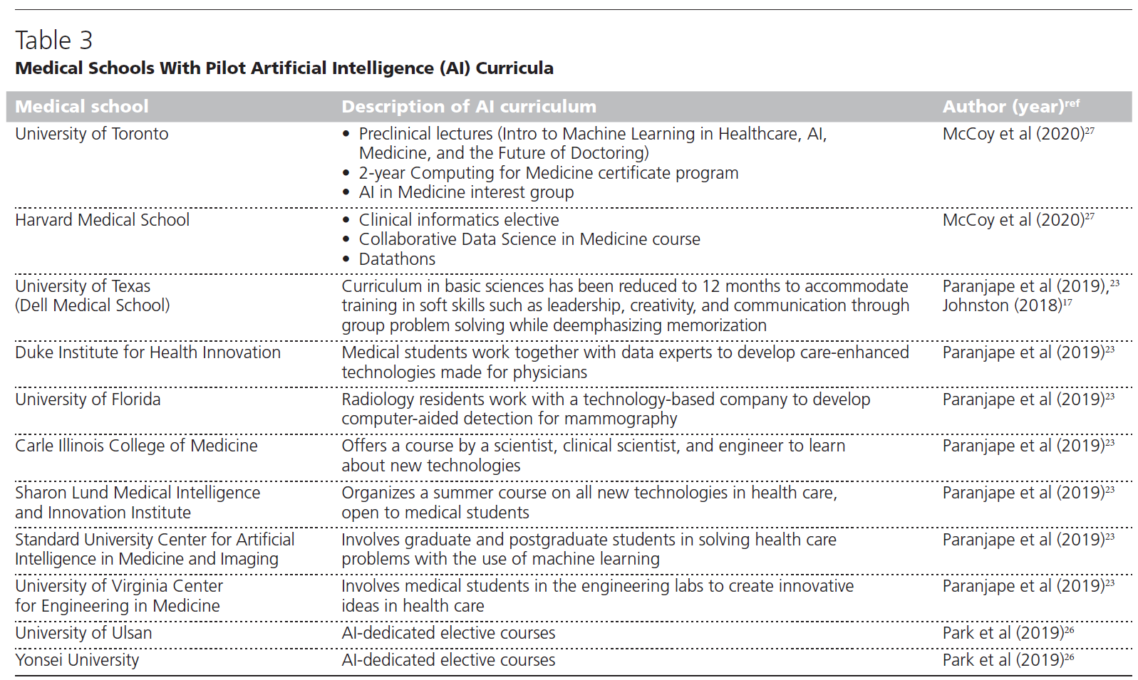 의학에서 AI의 통합이 임박하고 의료에 미치는 영향을 고려할 때, 저자는 의료 전문가들이 AI의 사용자이며 AI가 안전하고 적절하게 실제로 통합될 수 있도록 [AI 도구를 운전, 감독 및 평가drive, oversee, and evaluate]할 필요가 있다고 강조했다. 이에 따라, 저자들은 의과대학이 미래의 임상의에게 [AI와 함께 일하고, 관리하고, 상호작용하는 데 필요한 기술]을 가르칠 것을 주장했다. 나아가 맥코이 외 연구진과 콜라찰라마와 가그는 의과대학이 AI에 대한 학생들의 학문적 관심을 육성할 추가적인 책임이 있다고 주장했다.