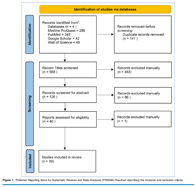 The initial searches performed resulted in a total of 729 articles. Removal of duplicates resulted in a total of 588 articles (Table 1). Medline search yielded 289 matches. Pubmed resulted in 251unique matches. Google Scholar search yielded a targeted group of 37 new matches. Web of Science search resulted in 11 new matches. We excluded titles that failed to mention AI in medical education (n = 463). Authors individually determined the significance of each article based on title and then compared results to find discrepancies. We then reviewed abstracts and excluded any articles that failed to describe the focus of AI as part of the medical curriculum (n = 86). At this point, the authors excluded any articles that did not focus on UME (n = 1). This resulted in 39 articles total that is displayed in a Preferred Reporting Items for Systematic Reviews and Meta-Analyses flowchart (Figure 1).