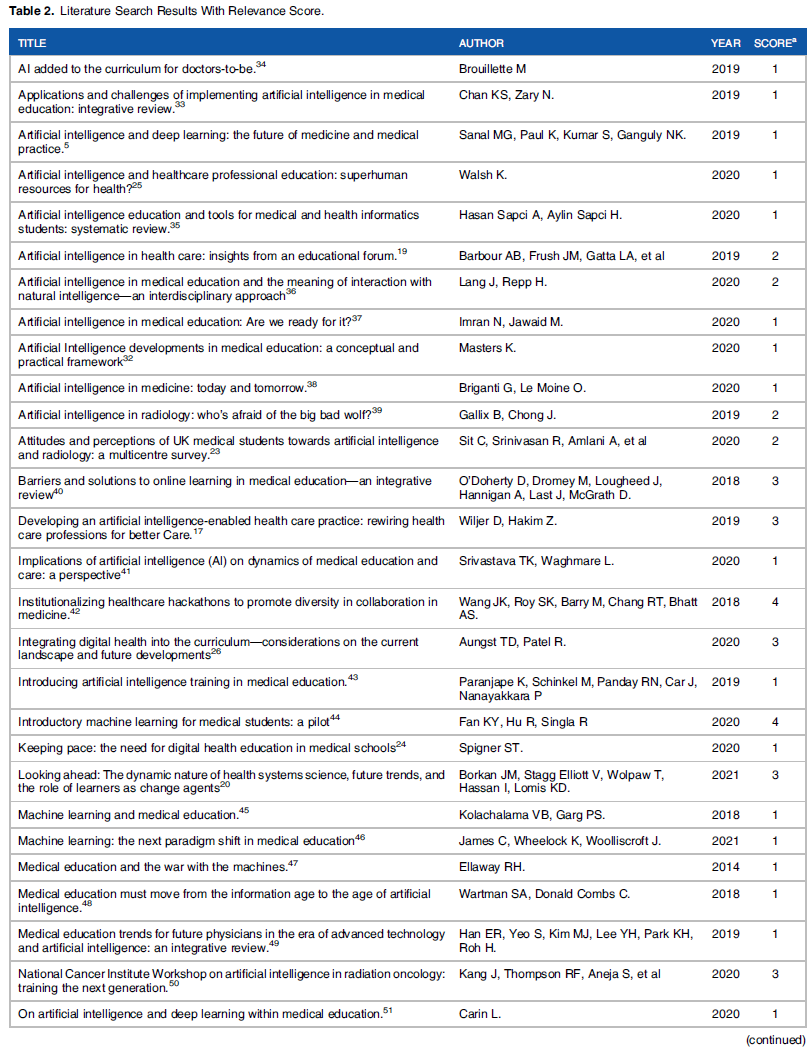 Conclusions: There are few plans or implementations reported on how to incorporate AI in the medical curriculum. Medical schools must work together to create a longitudinal study and initiative on how to successfully equip medical students with knowledge in AI.