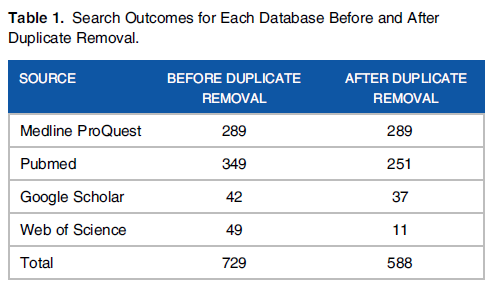 엑셀 기능을 이용하여 중복 연구들을 걸러냈다. 저자들은 관련성을 위해 미리 정해진 포함 및 제외 기준을 바탕으로 각 매치를 살펴보고 원고 제목과 초록을 분석하였다. 저자들 중 두 명은 포함 및 제외 기준에 대한 기사를 독립적으로 심사했다. 그들은 그들의 결과에 대해 토론했고 세 번째 저자를 사용하여 불일치를 해결했다. 그런 다음 동일한 방법으로 개별 기사를 기사 내용에 기반한 포함 기준 정확도에 대해 재분석하였다.
