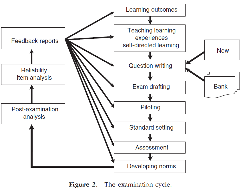 학습 측정은 고립된 사건이 아닙니다. 그것은 근본적으로 학습 요구의 식별에서 시작하여 예를 들어 의사, 간호사 및 기타 의료 전문가의 학습 결과로부터 시작하는 커리큘럼 주기의 일부이다. 그런 다음 이러한 학습 성과는 강의, 소규모 그룹 교육 또는 경험적 학습과 같은 가장 적절한 습득 방법에 대해 내린 결정의 기초가 된다. [학습의 측정] 또는 [평가]를 가지고 필요한 결과를 달성했는지 확인하는 것은 이 시점 이후입니다. 이 지점에서 [시험 후 분석]이 이루어지지만, 이것은 결과, 학습 및 평가의 커리큘럼 요소가 [커리큘럼 정렬]이라고 불리는 것에서 최적으로 표현되는지 여부를 확인하고자 하는 [커리큘럼 평가]의 전체 프로세스의 한 구성 요소일 뿐이다. 이 개념은 그림 1의 다이어그램으로 요약됩니다.