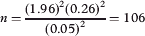 여기서 n은 표본 크기와 같으며, Z2는 표본 크기가 우연에 의해 얼마나 영향을 받는지 나타내는 신뢰 수준(90% 신뢰도는 1.64, 95% 신뢰도는 1.96, 99%는 2.57)이며, SD는 항목 모집단의 표준 편차 추정치이며, e2는 표본 크기의 오차(예: 0.03 또는 0.05)입니다. 따라서 표본 크기를 계산하려면 파일럿 연구 또는 이전 데이터에서 추정된 표준 편차가 필요합니다. 예를 들어, 문항 모집단에서 20문항의 무작위 표본을 추출하여 학생 그룹과 함께 시험하는 경우, 학생 점수의 표준 편차는 0.26으로 계산될 수 있다. 그런 다음 이 표준 편차를 표본 크기 공식에 대입하고 필요한 표본 크기를 계산합니다. 이 정보를 가지고 95% 신뢰 수준과 0.05 정밀도의 표본을 얻으려면 필요한 표본 크기(n)는 다음과 같이 계산됩니다.