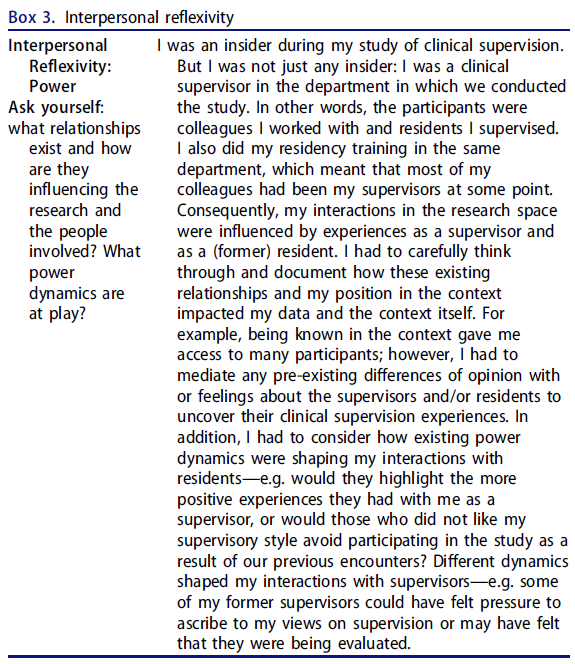 대인적 반사성(Box 3)은 [연구과정을 둘러싼 [관계]가 [맥락, 관련자 및 결과]에 어떤 영향을 미치는지] 나타낸다(Walsh 2003). 이들 중 가장 중요한 것은 [연구자와 참가자 사이의 관계]일 것이다. 대인 반사성에 대한 사려 깊은 접근은