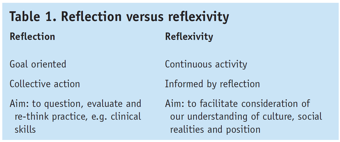 Reflexivity can be a complex concept to grasp when entering the world of qualitative research. In this article, we aim to encourage new qualitative researchers to become reflexive as they develop their critical research skills, differentiating between the familiar concept of reflection and reflective practice and that of reflexivity. Although reflection is, to all intents and purposes, a goal-oriented action with the aim of improving practice, reflexivity is a continual process of engaging with and articulating the place of the researcher and the context of the research. It also involves challenging and articulating social and cultural influences and dynamics that affect this context. As a hallmark of high-quality qualitative research, reflexivity is not only an individual process but one that needs to be considered a collective process within a research team, and communicated throughout the research process. In keeping with our previous articles in this series, we have illustrated the theoretical concept of reflexivity using practical examples of published research.