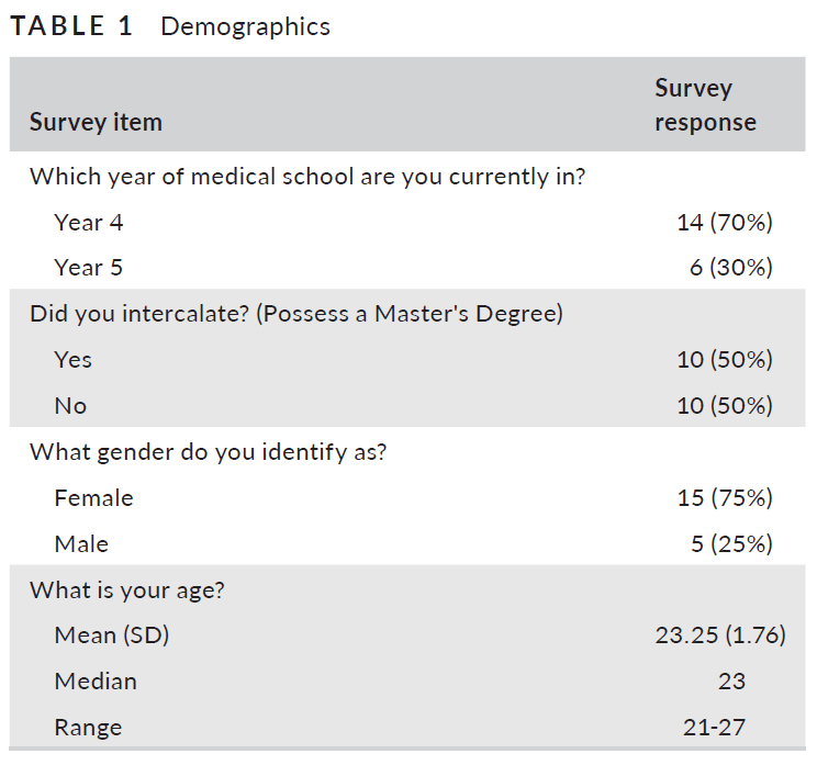 The 20 students were primarily in their fourth year of medical education, 15 women and 5 men participated. Table 1 provides full details of survey data.