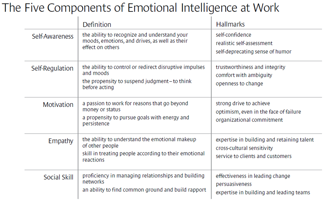 1995년 자신의 저서 '감정지능'을 통해 "감정지능"이라는 용어를 처음 널리 알린 사람은 다니엘 골먼이었고, 1998년 HBR 기사로 이 개념을 비즈니스에 처음 적용한 사람은 골먼이었다. 거의 200개에 달하는 글로벌 대기업을 대상으로 한 연구에서 골먼은 전통적으로 리더십과 관련된 자질(예: 지능, 강인함, 결단력, 비전)이 성공을 위해 요구되지만, 그 자질들은 불충분하다는 것을 발견했습니다. 진정으로 효과적인 리더는 또한 높은 수준의 감정 지능으로 구별되는데, 여기에는 자기 인식, 자기 조절, 동기 부여, 공감, 그리고 사회적 기술이 포함된다.