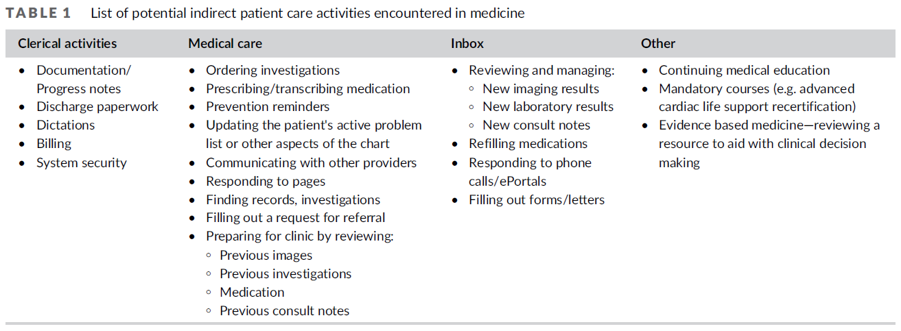 환자 치료의 활동은 환자와 직접 상호작용하는 시간에 국한되지 않는다. 일반적인 의사는 50% 이상의 시간을 간접 환자 치료 활동(IPCA) 또는 대면상호작용이 필요하지 않은 치료 작업에 소비합니다. IPCA는 비동기 업무, 사무실 외부 방문 및 데스크톱 의료라고도 할 수 있다. 표 1은 전자건강기록(EHR)의 '수신함' 관리 등 IPCA의 여러 가지 범주의 예를 제공한다. 여기에는 영상 및 실험실 결과 검토 및 관리, 상담 노트, 양식 작성 및 처방된 의약품의 보충이 포함된다.