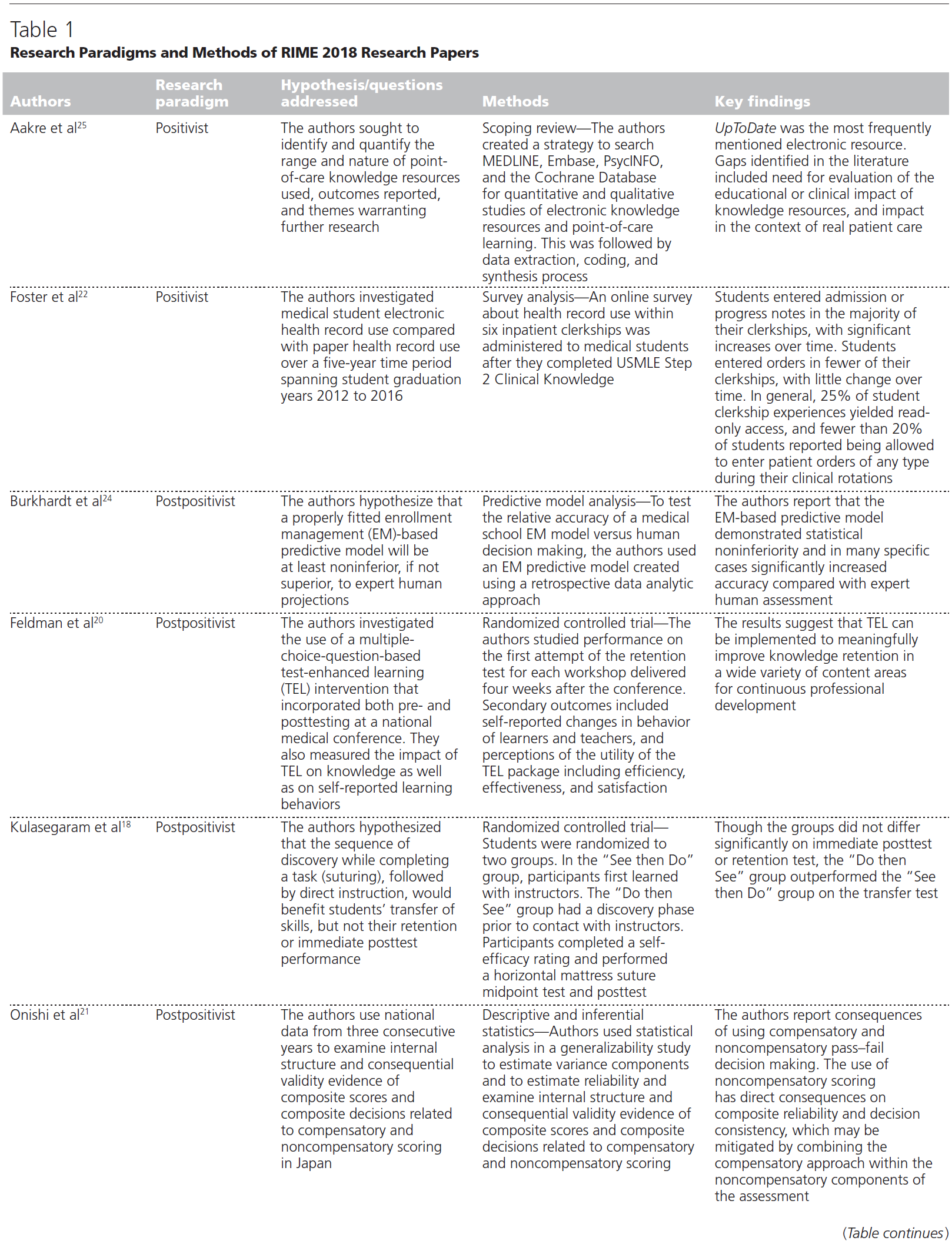 우리는 각 연구팀의 패러다임이 방법론에 어떤 영향을 미쳤는지 탐구함으로써 독자들에게 기사의 일반적인 요약을 제공하는 것을 넘어서는 것을 목표로 한다. "AM 마지막 페이지: 의학교육과 관련된 연구 패러다임에 대한 가이드"를 지침 프레임워크로 사용하여, 우리는 각 수용된 RIME 논문을 검토하여 작가의 연구 패러다임이 어떻게 가시화되고 사용되는 방법인 축성과 관련된 정보에 근거한 선택을 할 수 있는지 고려했다(표 1). 그런 다음 우리는 일상적인 교수 관행인 사전학에서 연구의 영향에 대해 논평한다. 우리는 저자들의 명시적인 진술이 없다면, 아래의 분류는 우리 자신의 해석을 나타내며, 저자나 다른 독자들이 동의하지 않을 수 있다는 것을 인식한다. 우리는 먼저 실증주의/후기실증주의 패러다임을 대표한다고 느끼는 연구 논문을 고려하고, 그 다음으로는 비판이론, 구성주의, 실용주의 패러다임을 가진 논문을 고려한다.