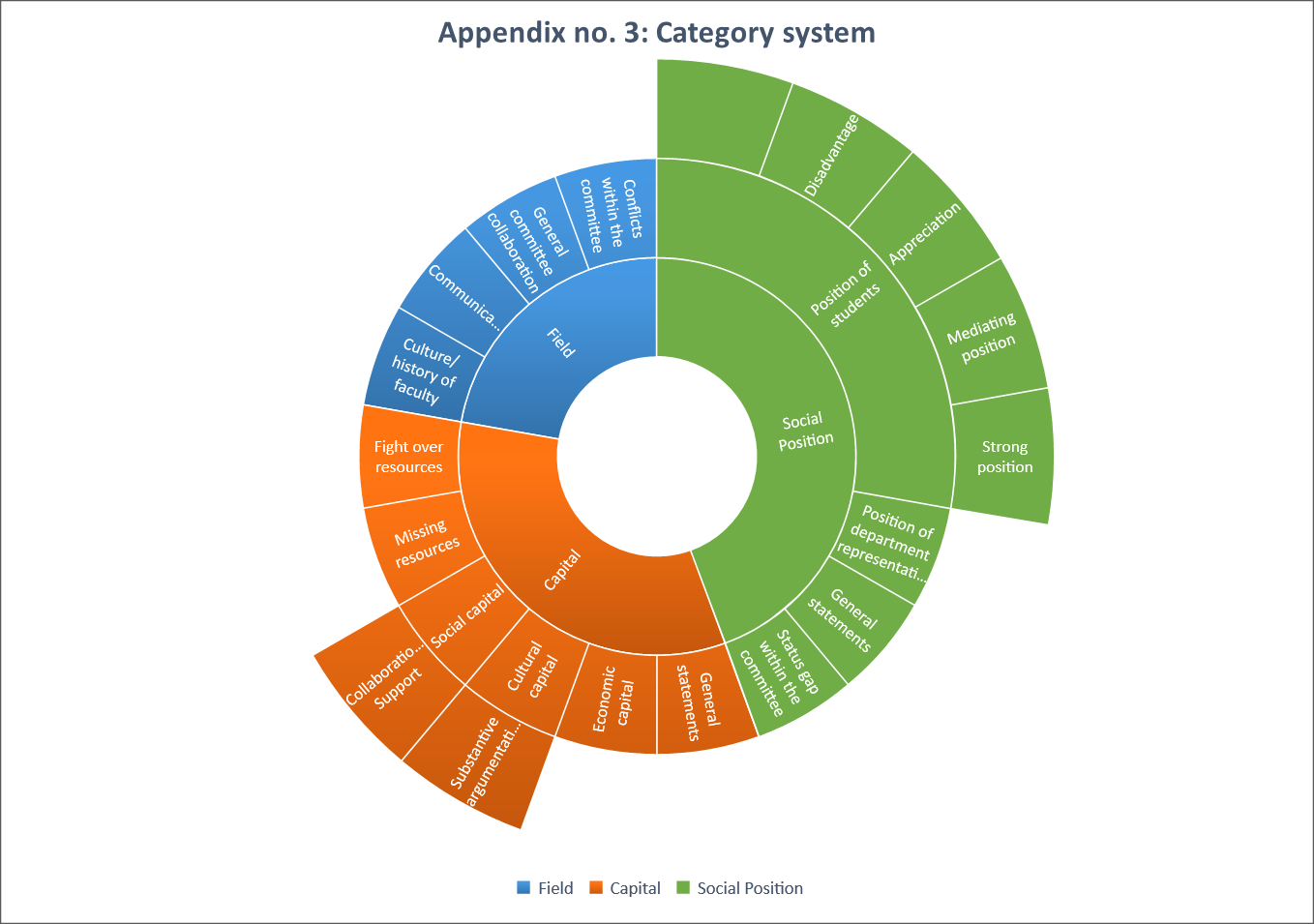 [경제적 자본]은 [문화적 자본]을 대표하는 특정한 교육 내용을 전달하는 것보다 우선시되었다. 결국, 그것은 여전히 돈에 관한 것이지 항상 내용에 관한 것은 아니다. (…) 중요한 주제가 누락되었다고 말해야 한다.(Q20-DR2) 흥미롭게도, 부서 대표들은 문화 자본의 한 형태로 학과 내용을 가르치는 데 있어 그들의 전문 지식을 알고 있었다: '물론, 나는 내 학과에 대한 구체적인 개념을 가지고 있었다. 나는 또한 이에 관한 교과서를 여러 권 썼는데, 누구나 나의 개념이 무엇이고 그것들을 어떻게 전달해야 하는지 읽을 수 있다'(Q21-DR1). 그러나 그들은 이 전략을 무기로 사용하지 않았다. 또한 사회적 자본의 전략적 활성화는 거의 없었다: '교수들은 각자 자신의 이익을 위해 노력하고 있었기 때문에 서로를 지지한 적이 없었다'(Q22-CR4).