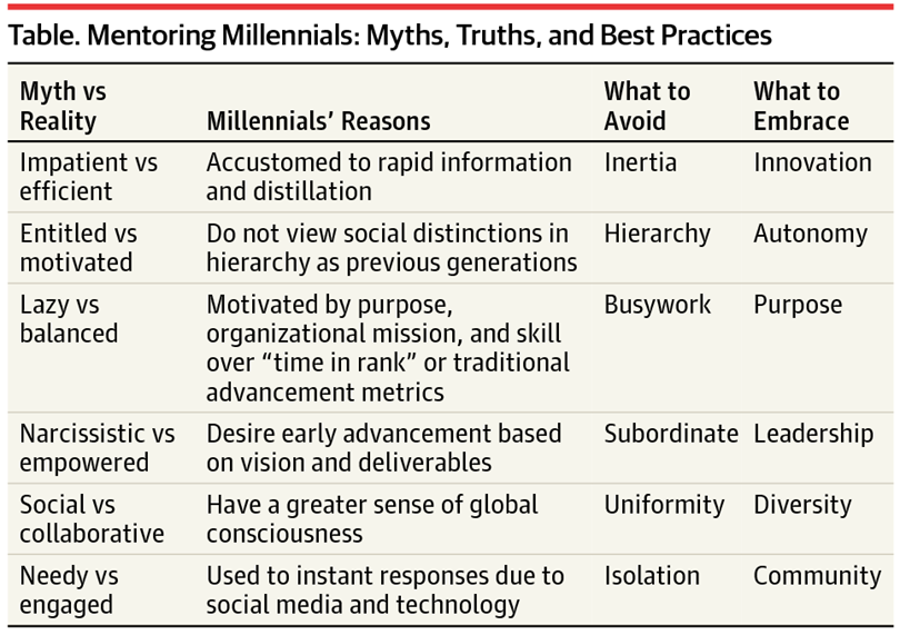 이러한 예들은 직장에 종사하는 다양한 세대들 사이의 잠재적인 갈등을 보여준다. 하지만, 이것들은 또한 새로운 세대를 더 잘 이해할 수 있는 기회이기도 하다. 세대 간의 사고방식과 동기에 대한 예리한 인식은 보다 생산적이고 보람 있는 멘토링 관계를 가능하게 하며, 여러 전략은 세대 간의 업무 관계를 개선할 수 있다. 첫째, 의사와 멘토는 일반적인 세대의 잘못된 인식을 인식해야 한다(표). 예에서 알 수 있듯이 밀레니얼 세대는 일반적으로 [빈번한 상호 작용]을 원하고, [멀티태스킹을 빠르게 수행]하며, [전 세계적으로 빠르게 연결]되는 기능을 즐긴다. 이러한 연결은 보통 짧기 때문에, 긴 대면 연결의 환경에서는 발생할 필요가 없다. 결과적으로, 밀레니얼 세대는 [전문적인 관계를 구축하는 데 중요한 기술에서 차이]가 있으며 ,[효율적이고 참여적이라기보다, 참을성이 없고 굶주린 것]으로 인식될 수 있다. 밀레니얼 세대를 가장 잘 끌어들이는 방법에 대한 제안은 다음과 같습니다: