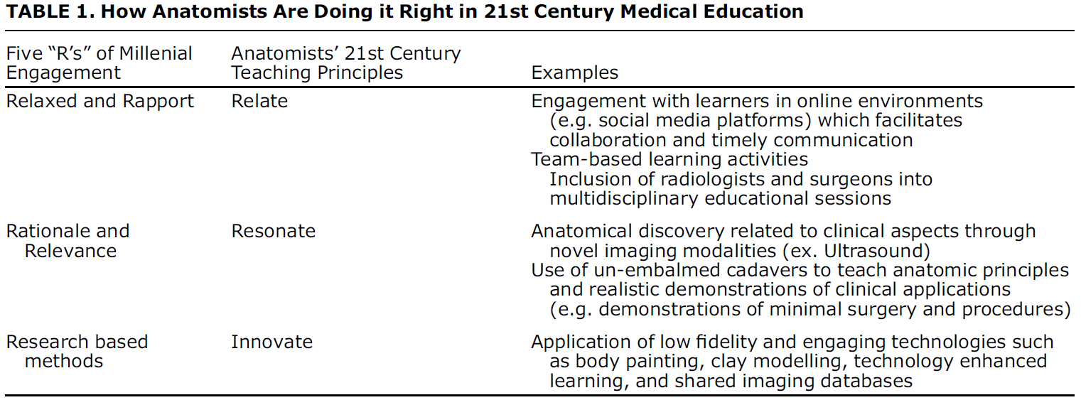 In facilitating these major changes, anatomists have demonstrated a keen ability to adopt and evolve new pedagogical approaches that highlight three effective principles in engaging today's learners (Table 1):