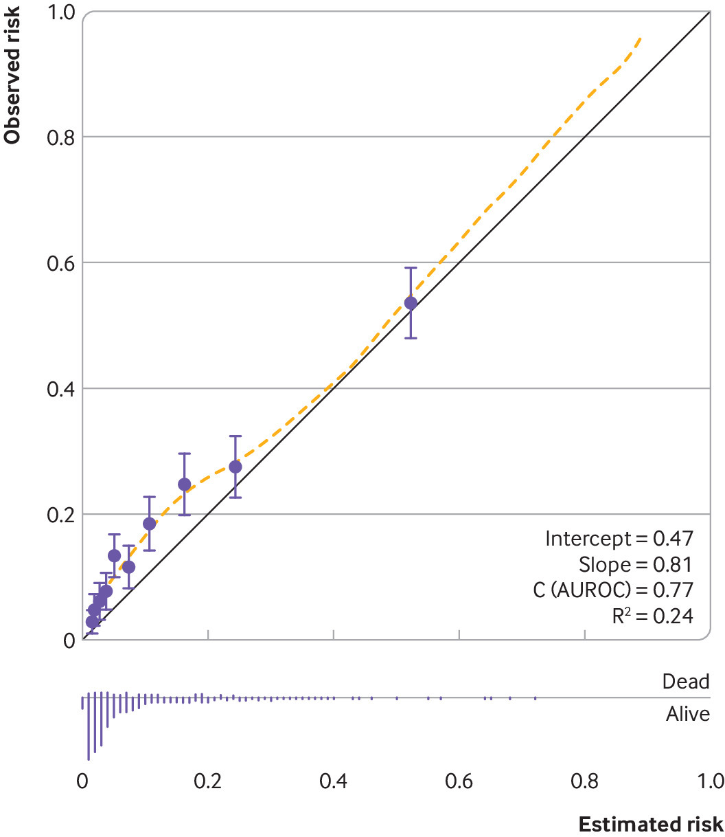Fig 3. Example of a calibration plot to examine agreement between observed risks and estimated (predicted) risks from a prediction model.64 The study developed prediction models to estimate the risk of mortality in individuals who experienced subarachnoid haemorrhage from ruptured intracranial aneurysm. Circles are estimated and observed risks grouped by 10ths of estimated risks, and the yellow dashed line is a loess smoother to capture agreement across the range of estimated risks. AUROC=area under the receiving operator characteristic