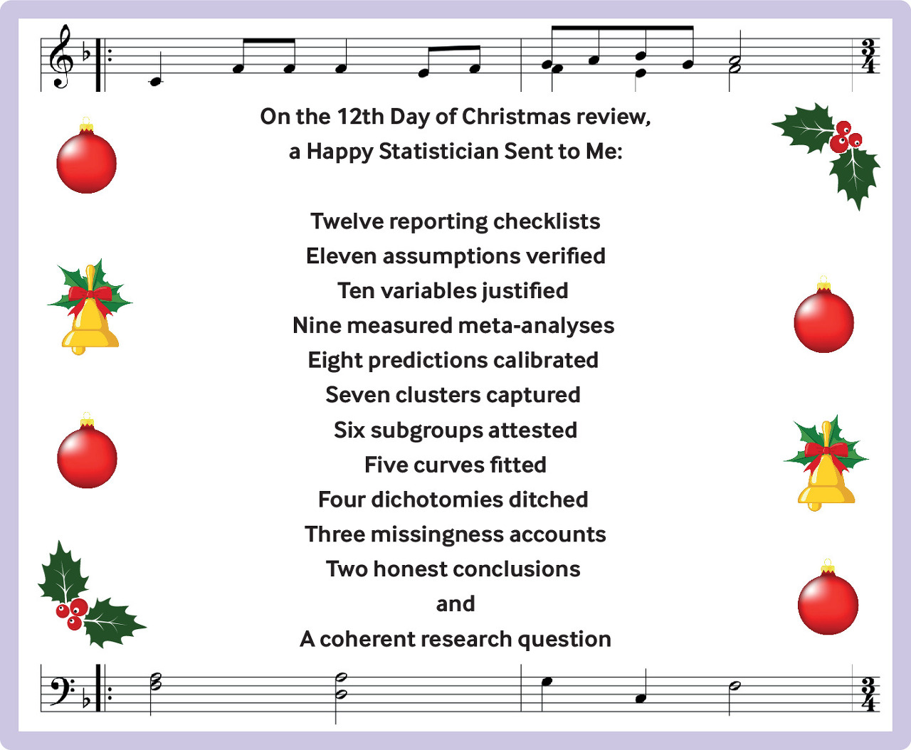 Authors should address this list before rushing to submit papers to The BMJ next Christmas, in order to bring joy to the world by reducing the length of statistical reviews and allowing the statistical editors to spend more time with their significant (yes, pun intended) others over the festive period. If authors did adhere to this guidance, the “On the 12th Day of Christmas” song would change to the very positive “On the 12th Day of Christmas Review” with lyrics reflecting feedback from a happy statistician (perhaps join in using the song sheet in figure 4).