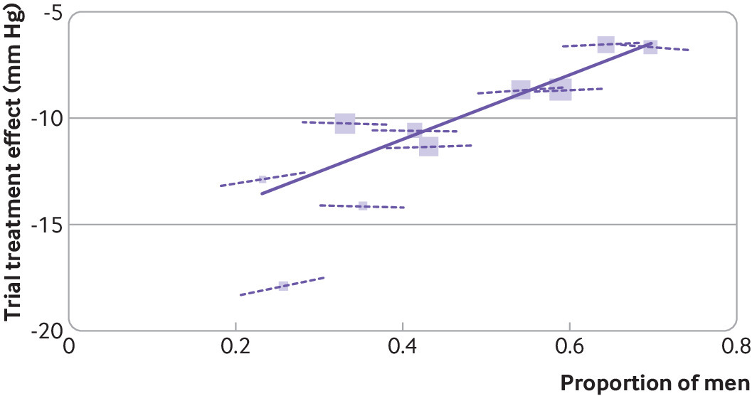 그림 2. 치료-공변량 상호작용의 개별 참가자 데이터 메타분석이 아닌 연구 수준 결과의 메타회귀를 사용할 때의 [집계 편향]. 연구 질문은 [혈압을 낮추는 치료]가 [남성보다 여성들 사이에서 더 효과적인지]에 대한 것이었다. 10번의 고혈압 치료 실험의 메타 분석을 통해 증거를 보여주며, 치료 효과와 비율 남성(실선)의 임상적 연관성을 비교한다. 이는 가파르고 통계적으로 중요하다. 각 실험(점선)에서 성별과 치료 효과의 참가자 수준 상호작용을 비교한다. 통계적으로 중요하지 않습니다. 이 사례 연구는 이전 작업을 기반으로 합니다. 각 블럭은 시행 크기에 비례하는 블럭 크기를 사용하여 하나의 시행을 나타냅니다. 시험 간 연관성은 남성 비율에 대한 시험 치료 효과의 메타 회귀에서 파생된 실선의 기울기로 표시되며, 이는 남성에 비해 여성만을 대상으로 한 시험에서 15mm Hg(95% 신뢰 구간 8.8~21mm Hg) 더 큰 수축기 혈압 감소 효과를 시사한다. 그러나 참가자 수준 데이터에 기초한 치료-성 상호작용은 각 시험 내에서 파선의 기울기로 표시되며, 평균적으로 이는 임상적으로나 통계적으로 유의하지 않은 남성보다 여성의 치료 효과가 0.8mm Hg(-0.5~2.1mm Hg) 더 클 뿐이다