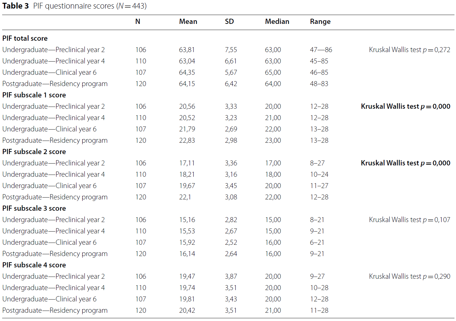 표 3은 4개 그룹의 총 PIF 점수 차이를 보여주며, 통계적으로 유의하지는 않지만 6학년 학생과 2단계 전공의의 점수가 다른 2개 그룹보다 높았다. '전문적 역할의 인식과 내재화', '전문적 행동에 대한 자기 통제'와 관련하여 각각 하위척도 1과 2에서 유의미한 하위척도 점수 차이가 관찰된다. Mann-Whitney 시험 결과를 사용한 사후 분석은 수정된 Bonferronip [35]을 사용하여 다음과 같이 설명된다: