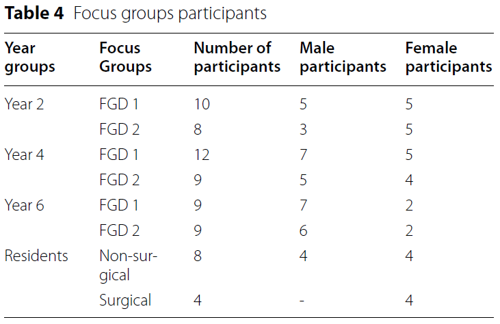 In order to best represent views on PIF, focus group (FG) participants were purposively selected using maximum variety sampling approach from those who filled out the questionnaires and agreed to be invited to a focus group session [29]. The maximum variety sampling approach was used to select the FG participants, accounting for representativeness regarding gender and study program (for residents). Two FGs were conducted for each class group (years 2, 4, and 6) of undergraduate program; two other FGs were conducted for residents in both surgical and nonsurgical study programs.