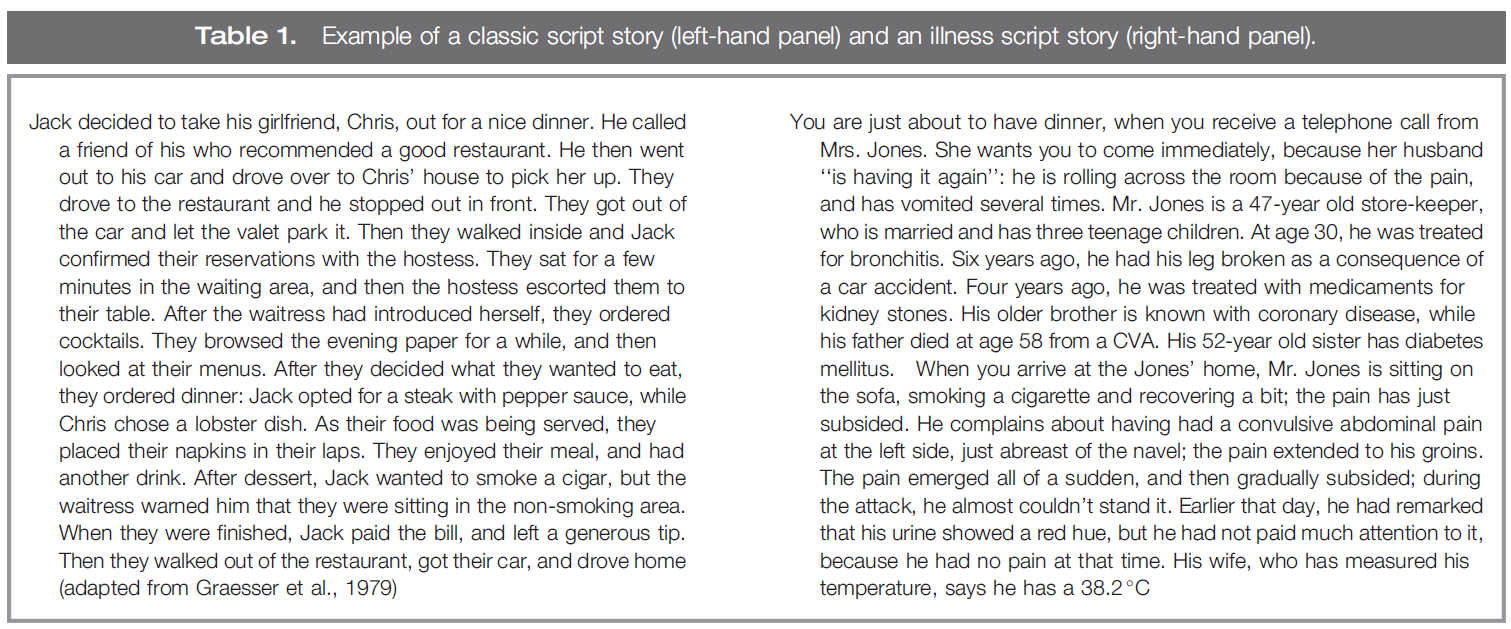 At a superficial level, the analogy between “real life” scripts and “illness” scripts is obvious: most, if not all, diseases can be construed as a sequence of events occurring in a patient. The script, or generic event sequence, maps onto the general clinical picture of a disease, whereas each individual patient can be considered an instantiated illness script, with both typical (central) or atypical (peripheral) features, which appear in a certain order. To illustrate the analogy, Table 1 contrasts a real life script (the restaurant script; adapted from Graesser et al. 1979) with an illness script (a patient with a renal colic). At a deeper level, the central theme of both real life scripts and illness scripts is to provide a format to represent implicit causal coherence of knowledge (Schank 1975; Schank & Abelson 1977).