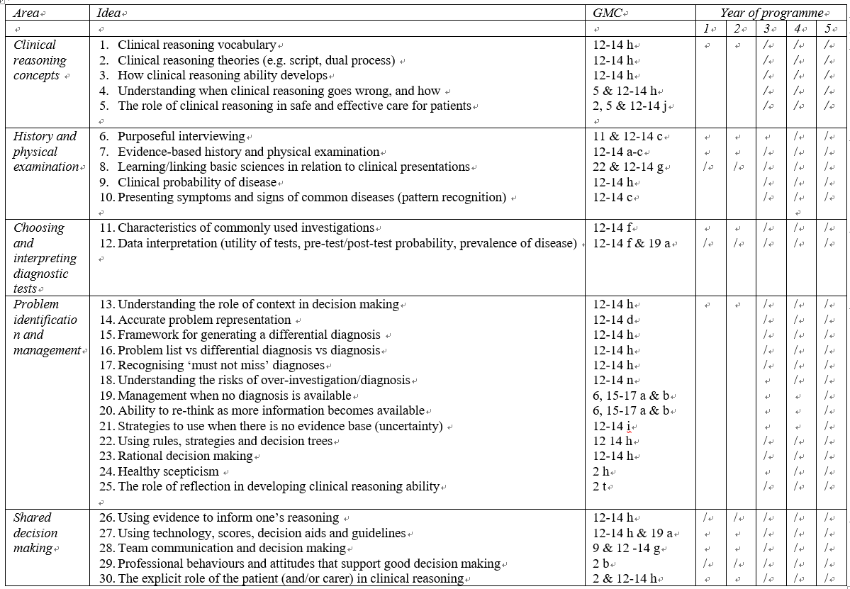 Results: The group identified 30 consensus ideas that were grouped into five domains: (1) clinical reasoning concepts, (2) history and physical examination, (3) choosing and interpreting diagnostic tests, (4) problem identification and management, and (5) shared decision making. The literature review demonstrated a lack of effectiveness for teaching the general thinking processes involved in clinical reasoning, whereas specific teaching strategies aimed at building knowledge and understanding led to improvements. These strategies are synthesised and described.