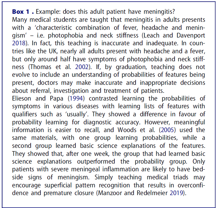 Learners should be able to accurately synthesise data from the history and physical examination to judge the clinical probability of disease using their knowledge of epidemiology, the probability of the presence of particular symptoms and signs in specific diseases (see example in Box 1) and likelihood ratios, where relevant. While typical presentations of diseases and simple lists of features may be taught in the early years, by graduation learners should have a clear understanding, relevant to their local context, that many patients do not present with the classical features of diseases as described in textbooks (Manzoor and Redelmeier 2019). Learners need to be able to estimate the clinical probability of disease in order to be able to accurately interpret diagnostic test results, including normal results and incidental findings.