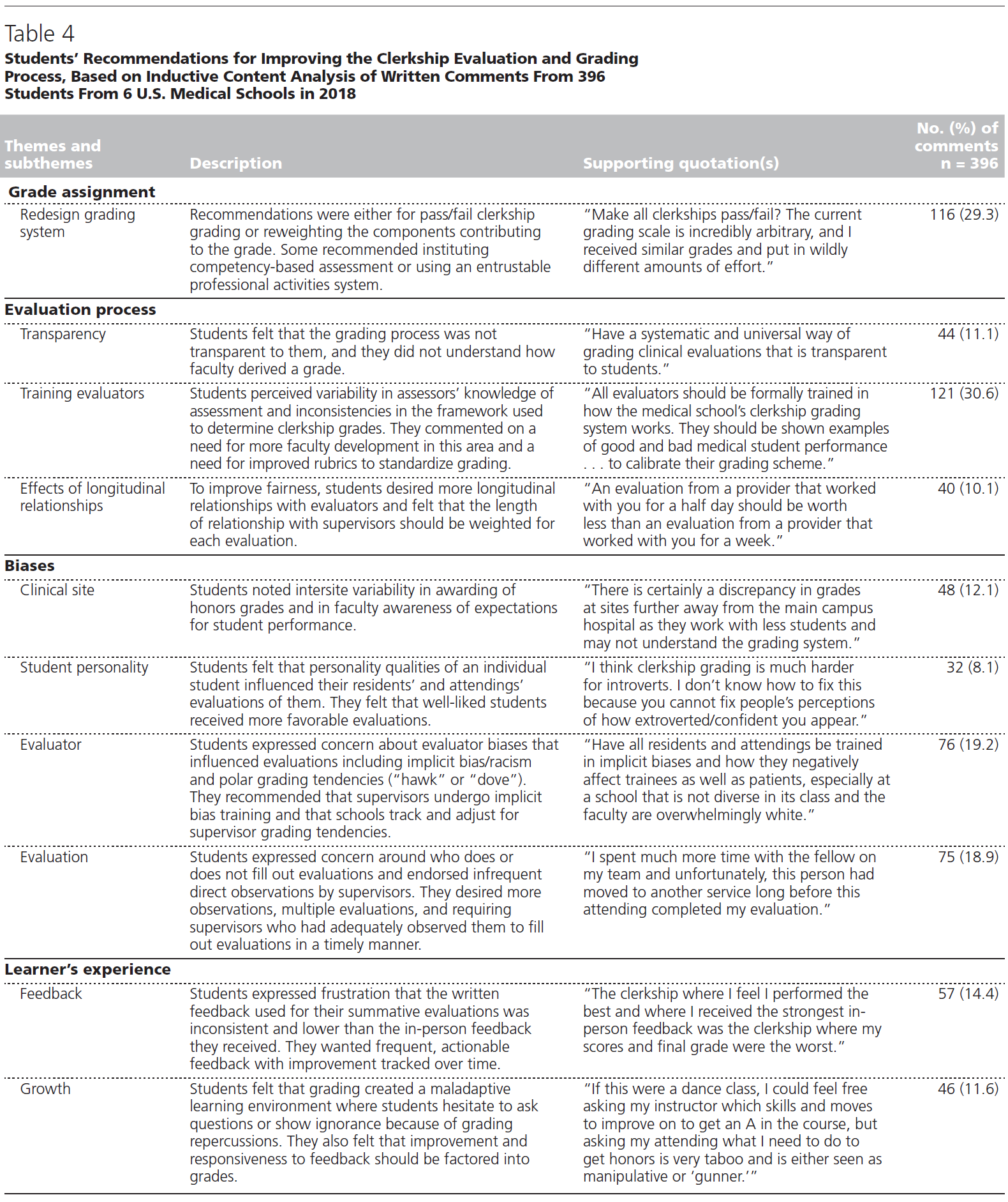 Students’ comments addressed 4 themes: grade assignment, evaluation process, bias causing differential grading, and learners’ experience (Table 4).