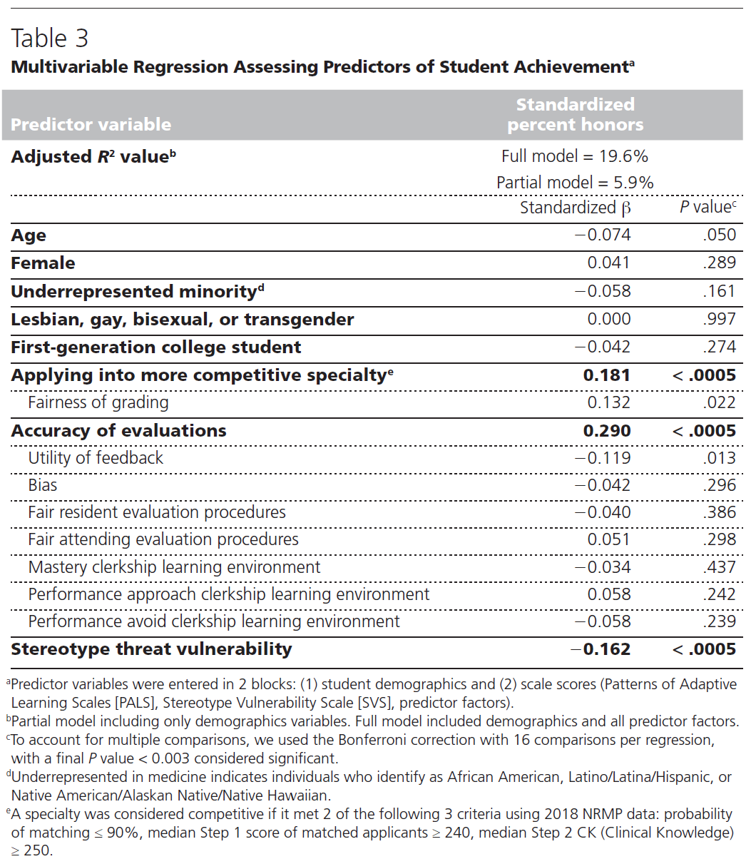 우등상은 더 [경쟁이 치열한 전문과에 지원]하는 것(베타 = 0.18, P < .0005)과 [평가가 더 정확하다고 인식]하는 것(베타 = 0.29, P < .0005)과 정(+)의 상관관계가 있는 것으로 나타났습니다(표 3). 명예 획득은 [고정관념 위협과 음의 상관관계]가 있었습니다(베타 = -0.162, P < .0005). 획득한 우등과 채점의 공정성에 대한 인식, 참석 또는 레지던트 평가 절차, 임상실습의 숙련도 또는 수행 환경에 대한 인식 간에는 유의미한 연관성이 없었습니다.