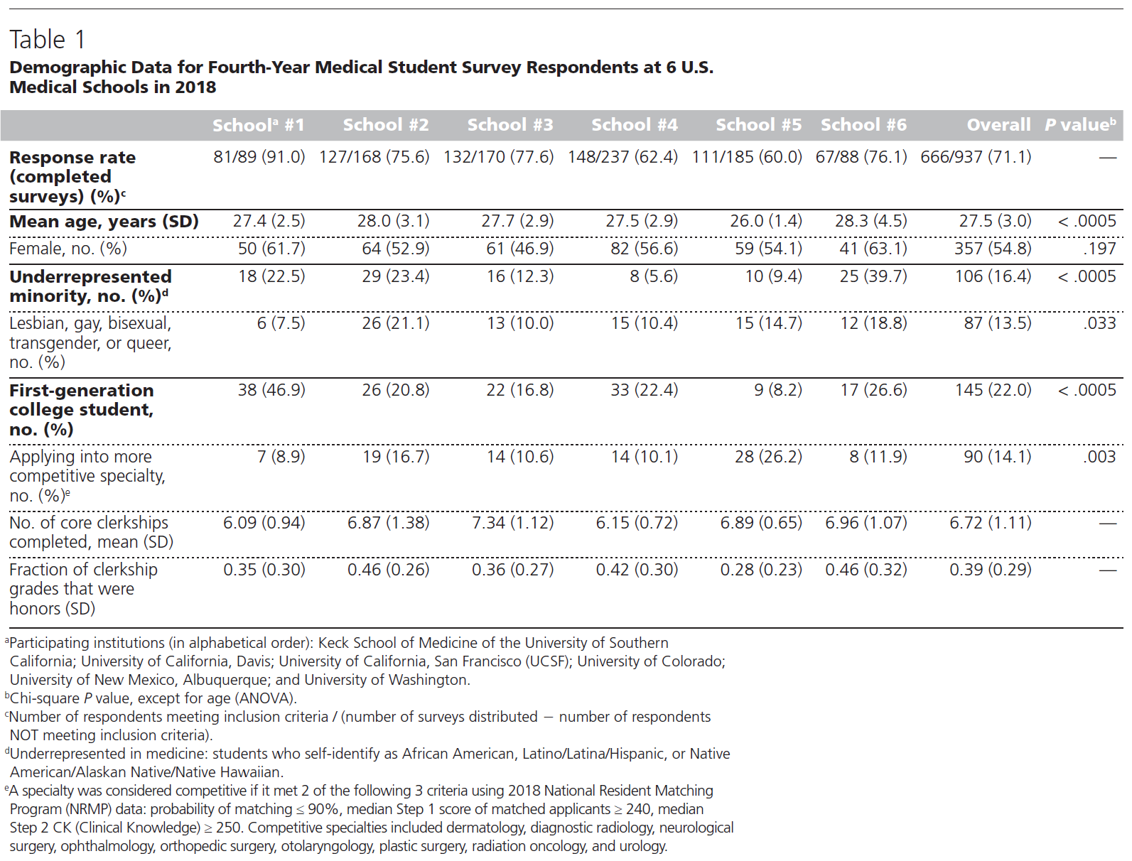 전체적으로 972명의 학생이 설문조사 초대를 받았고, 757명이 설문조사를 시작했으며, 701명이 설문조사를 완료했습니다. 35명의 학생이 제외 기준을 충족했습니다: 34명은 3개 미만의 임상실습을 이수했으며, 1명은 이수한 임상실습보다 더 많은 우등상을 받았다고 답했습니다. 최종 응답률은 666/937(71.1%)이었습니다. 참가자의 평균 연령(SD)은 27.5세(3.0)였으며, 54.8%가 여성, 16.4%가 UIM이었습니다(표 1). 이 비율은 2018년 전국 AAMC 의과대학 졸업생 설문조사 표본의 비율과 유사하며, 이 중 49.1%가 여성, 15.5%가 UIM이었습니다.42 응답자들은 평균 6.7회(1.1회)의 핵심 서클러십을 이수한 것으로 나타났습니다. 평균 연령, UIM 학생 비율, 경쟁이 치열한 전문 분야에 지원한 비율은 학교별로 통계적으로 유의미한 차이가 있었습니다(표 1).