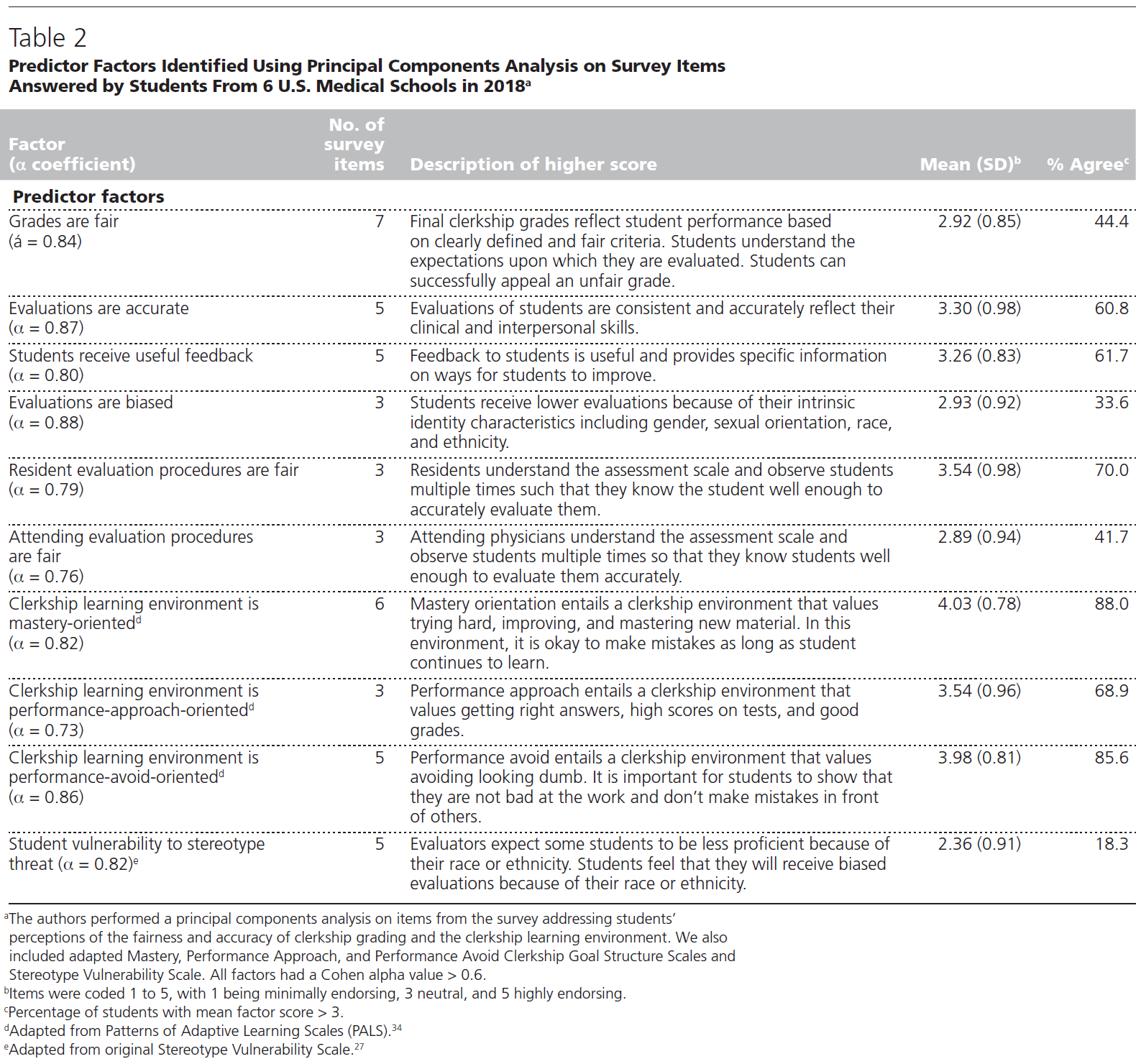We used principal components analysis for data reduction, treating Likert scale questions as continuous 1–5 variables for perceptions of fairness and accuracy of grading and clerkship learning environment. We used varimax rotation, retaining factors with an eigenvalue ≥ 1 and a maximum of 25 iterations before convergence. We used pairwise deletion for missing data. The Kaiser–Meyer–Olkin test was > 0.80, indicating sufficient correlation amongst items. Items were assigned to factors based on their largest loading. Because the PALS motivation scales and SVS were previously validated and still had high internal consistency with our minor modifications, they were not included in the principal component analysis.28,35 For all factors, we calculated the Cronbach alpha coefficient and nonweighted mean score, retaining factors with Cronbach alpha > 0.6. Items were reverse-coded as needed so that all factor loadings were positive. For each retained factor, we calculated a scale score, treated as a continuous variable equal to the mean of the items comprising the factor. For scale scores, we categorized < 3 as “disagree,” > 3 as “agree,” and = 3 as “neutral.” An SVS score > 3 indicated vulnerability to stereotype threat.