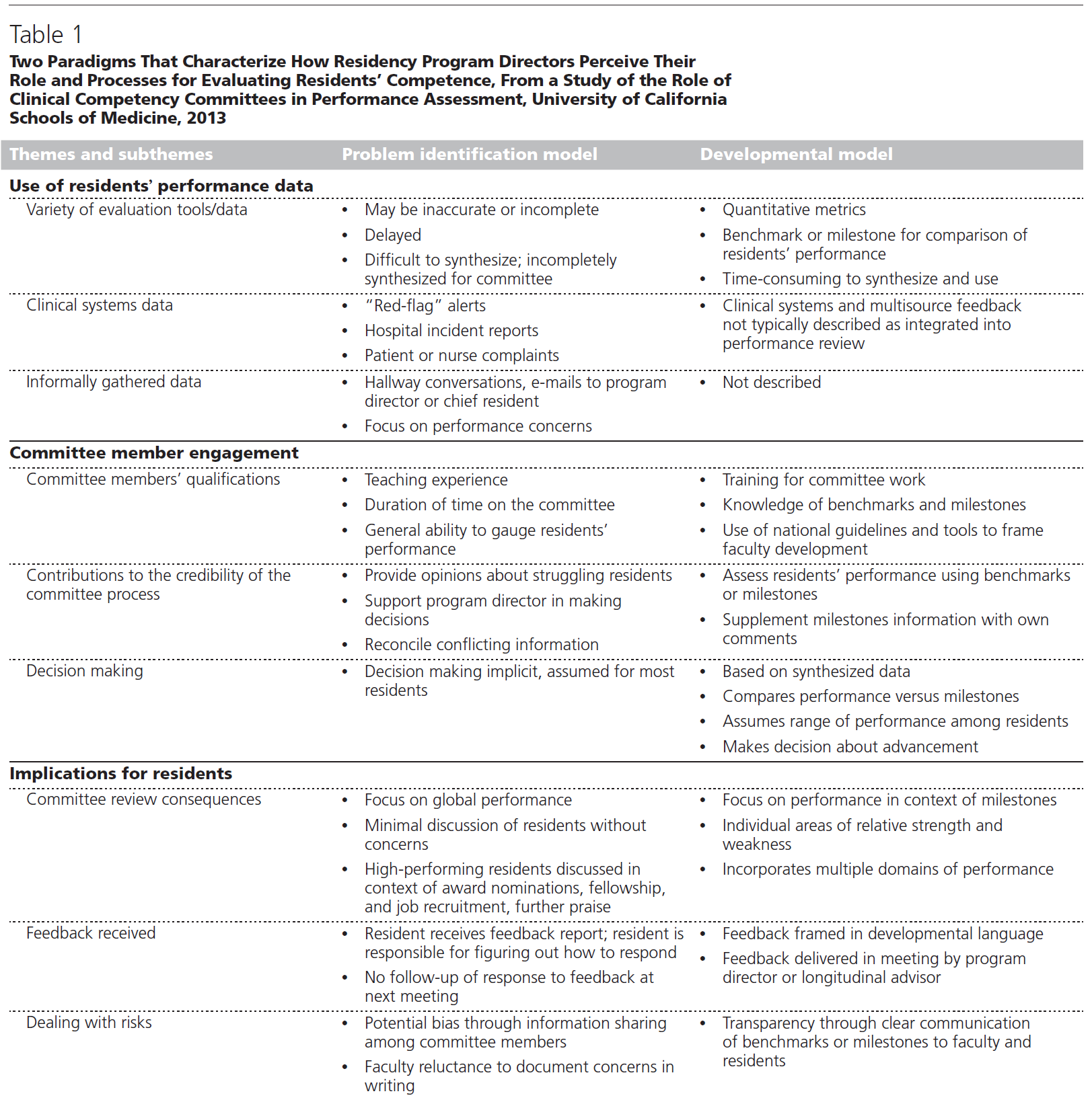 Results: The purpose of resident performance review at all institutions was oriented toward one of two paradigms: a problem identification model, which predominated; or a developmental model. The problem identification model, which focused on identifying and addressing performance concerns, used performance data such as red-flag alerts and informal information shared with program directors to identify struggling residents.In the developmental model, the timely acquisition and synthesis of data to inform each resident's developmental trajectory was challenging. Participants highly valued CCC members' expertise as educators to corroborate the identification of struggling residents and to enhance credibility of the committee's outcomes. Training in applying the milestones to the CCC's work was minimal.Participants were highly committed to performance review and perceived the current process as adequate for struggling residents but potentially not for others.
