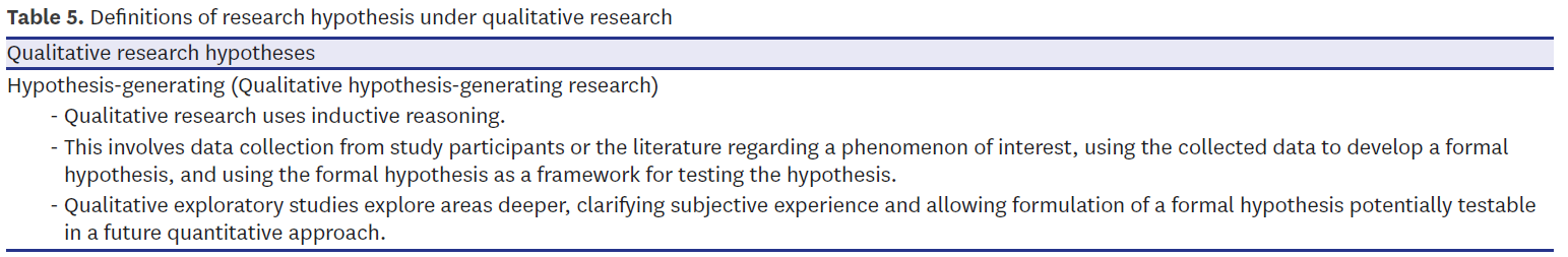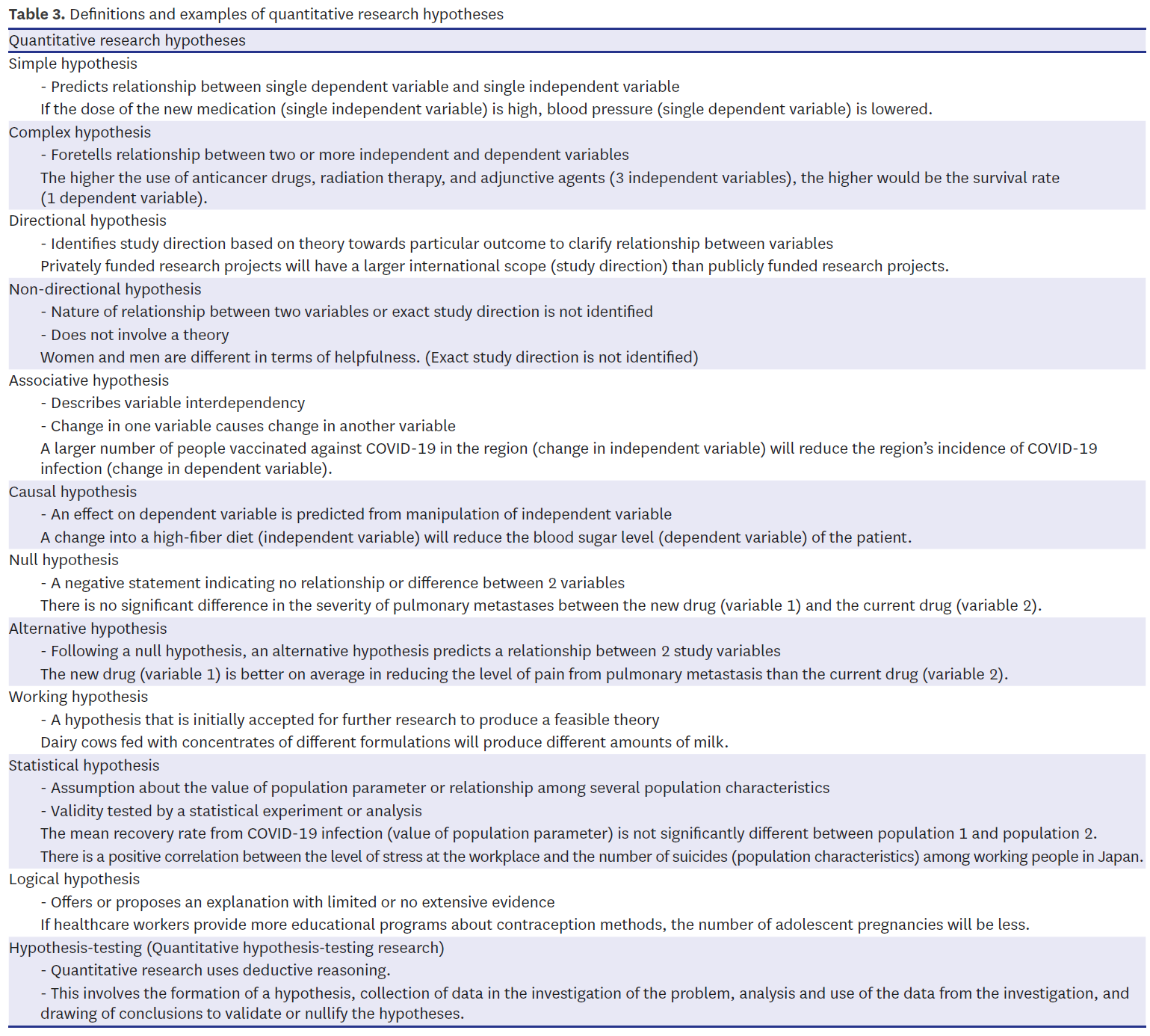 정량적 연구에서 단순, 복합, 방향성, 비방향성, 연관성, 인과, 무(無), 대안, 작동, 통계적, 논리적 가설의 예와 정량적 가설 검증 연구의 정의는 표 3에 나와 있습니다.