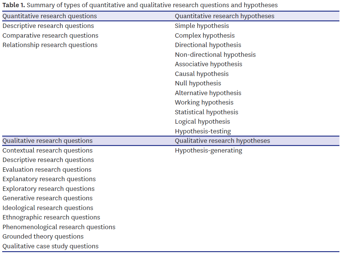 Research questions and hypotheses are developed according to the type of research, which can be broadly classified into quantitative and qualitative research. We provide a summary of the types of research questions and hypotheses under quantitative and qualitative research categories in Table 1.