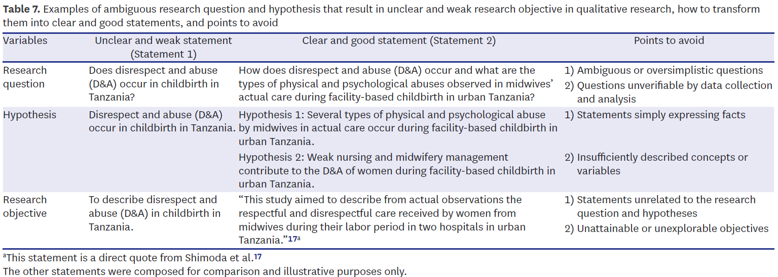 As we indicated earlier, research questions and hypotheses that are not carefully formulated result in unethical studies or poor outcomes. To illustrate this, we provide some examples of ambiguous research question and hypotheses that result in unclear and weak research objectives in quantitative research (Table 6)16 and qualitative research (Table 7)17, and how to transform these ambiguous research question(s) and hypothesis(es) into clear and good statements.