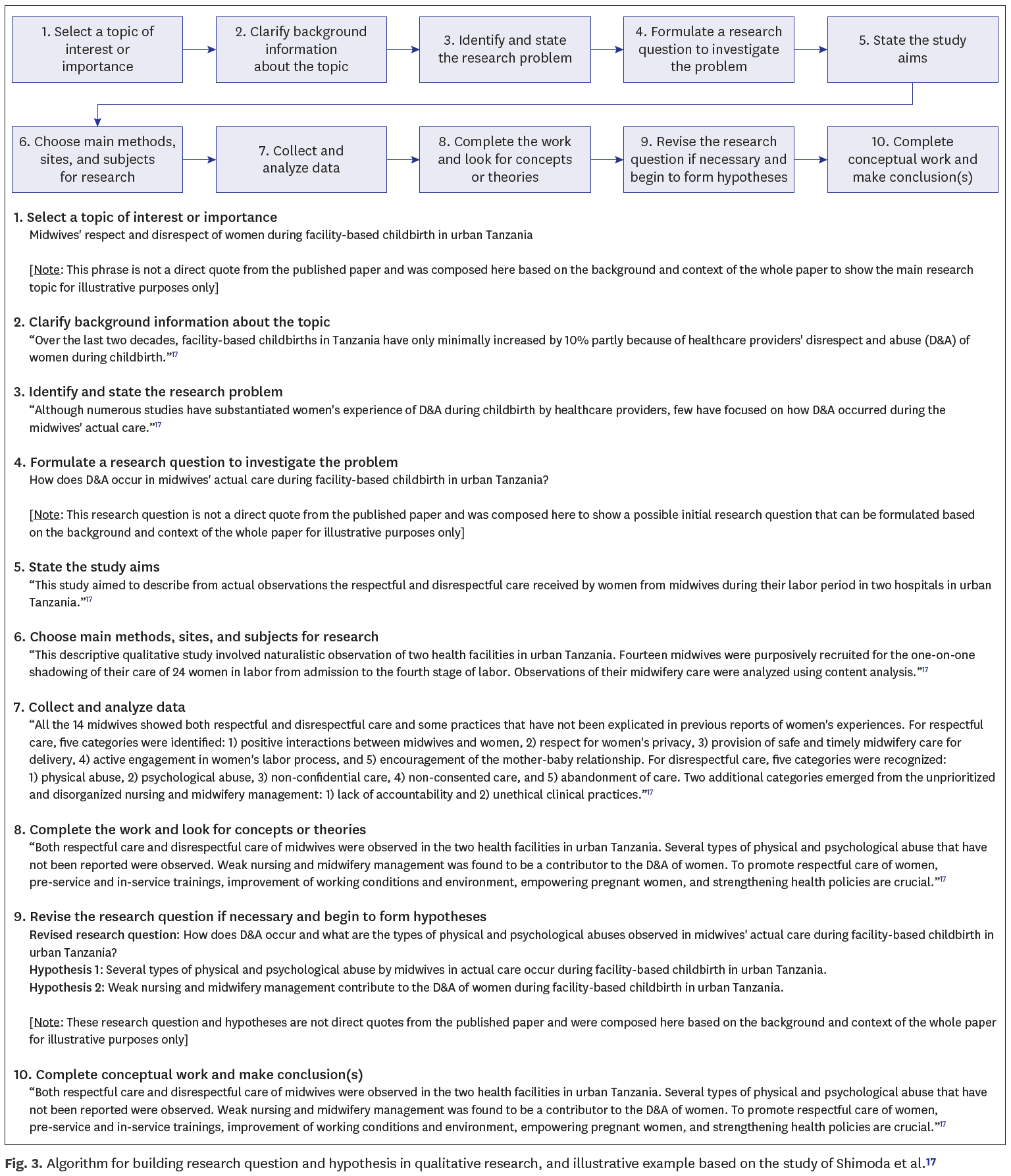요약하면, [연구 질문]은 [연구의 배경]을 설정한 후 구성됩니다. 그런 다음 [연구 질문]에 따라 [가설을 개발]합니다. 따라서 우수한 가설을 도출하기 위해서는 우수한 연구 질문을 갖는 것이 중요합니다. 연구 질문에 따라 연구 목표와 연구 설계가 결정되고 궁극적으로 연구 결과가 결정됩니다.12 연구 질문과 가설을 구축하는 알고리즘은 정량적 연구의 경우 그림 2에, 질적 연구의 경우 그림 3에 나와 있습니다.