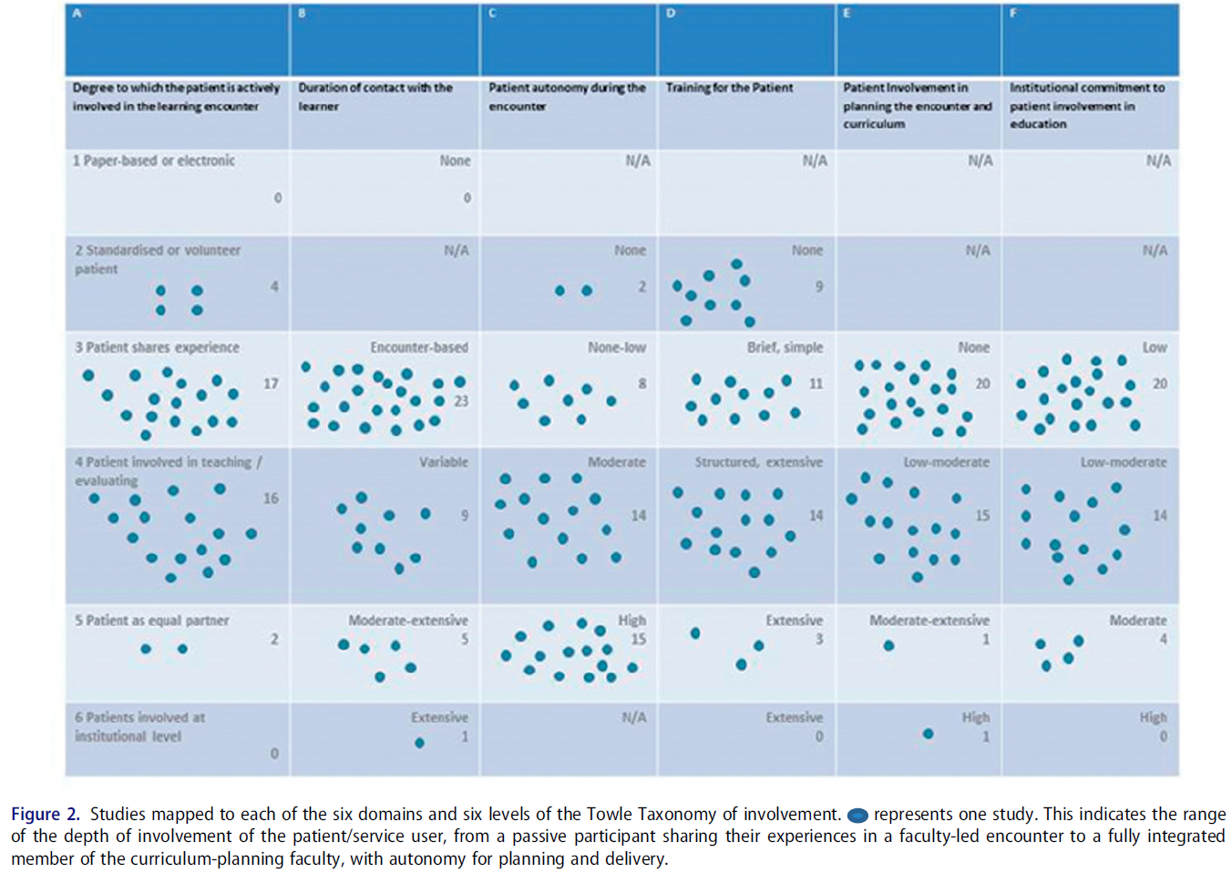 This systematic review has several limitations: the search was restricted to the English language only articles due to a lack of availability of translation services. A frustrating constraint was the lack of consistency over the terminology used to describe patients/service users involvement in patient-centered care and medical education. As is always required in any synthesis, pragmatic judgments had to be made, as well as a measurement of the author’s level of agreements within the review. However, it is possible that certain papers were not included that may be relevant. Related to this, a pragmatic decision was made to not include paper-based or electronic scenarios within this review (Level 1 of Towle’s Taxonomy). The review is also limited by the methodological quality of the included studies pertaining to the lack of detail in reporting – particularly around theoretical concepts, pedagogy, and curricula. This precluded any form of synthesis of the outcomes of the studies.