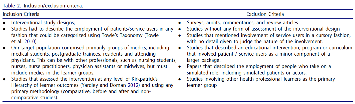 The inclusion and exclusion criteria are shown in Table 2. Studies had to discuss the service user involvement in more than a cursory fashion as scoping searches found several studies that simply made a single statement about including service users and no further details. This was independently judged by two authors performing the searches. Studies also had to describe some form of assessment of the intervention in practice to confirm its actual deployment for learners, but any method could be used. The inclusion of medical learners was an arbitrary decision and may lead to the need for future reviews in other settings.