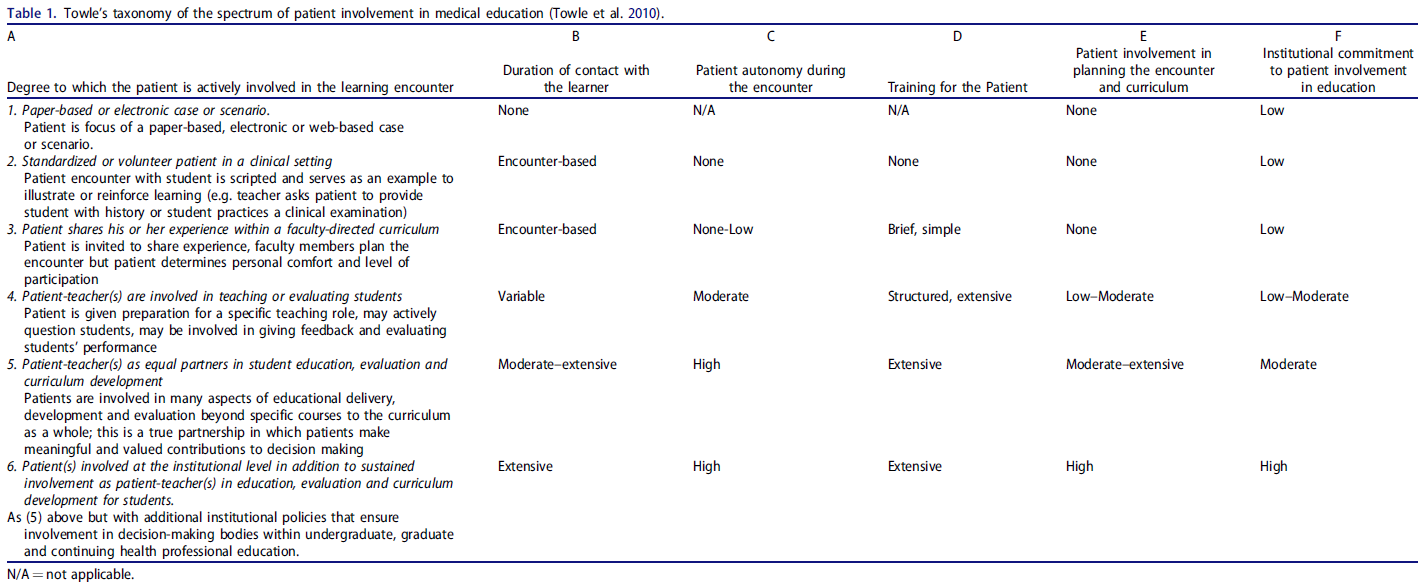The Towle Taxonomy was selected as a pragmatic, comprehensive framework that enables us to highlight the significant diversity of servicer user involvement within medical education.