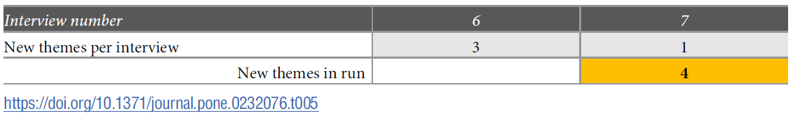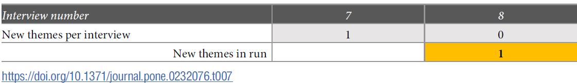 이 시점에서 마지막 실행으로 [추가된 새로운 정보의 비율]이 우리가 설정한 [≤5% 임계값]보다 낮으므로 8번째 인터뷰 후 여기서 멈추고 주관적인 지표인 ≤5%에 따라 포화 상태에 도달했다고 말할 수 있는 수준으로 새로운 정보의 양이 감소하고 있다는 것을 알 수 있습니다. 마지막 두 번의 인터뷰는 수집된 정보에 크게 추가되지 않았으므로 [6번째 인터뷰]에 포화 상태에 도달했다고 말할 수 있습니다(다음 두 번의 인터뷰는 각각 얼마나 많은 새로운 정보가 생성되는지, 그리고 이것이 설정된 임계값 아래로 떨어질지 확인하기 위해 완료되었습니다). 인터뷰 번호에 위첨자 "+2"를 추가하여 총 8개의 인터뷰가 완료되었음을 표시함으로써 이 두 개의 추가 인터뷰(실행 길이를 나타냄)에 주석을 달 것입니다. 포화 평가를 작성할 때 기본 크기 4를 사용하면 6+2번의 인터뷰를 통해 ≤5%의 새로운 정보 임계값에 도달했다고 말할 수 있습니다.