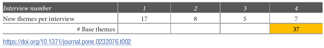 - Similarly, Guest et al. [9] conducted a stepwise inductive thematic analysis of 60 in-depth interviews among female sex workers in West Africa and discovered that 70% of all 114 identified themes turned up in the first six interviews, and 92% were identified within the first 12 interviews.