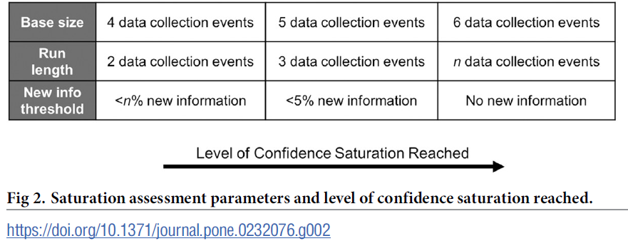 평가의 목적상, [포화]는 데이터 분석 중 들어오는 데이터 포인트(인터뷰)가 연구 목표와 관련하여 새롭고 유용한 정보를 거의 또는 전혀 생성하지 않는 시점을 의미합니다. 이러한 포화의 정의를 운영하기 위한 우리의 접근 방식은 [기본 크기, 실행 길이, 들어오는 새로운 정보의 상대적 양 또는 새로운 정보 임계값]이라는 [세 가지 요소]로 구성됩니다.