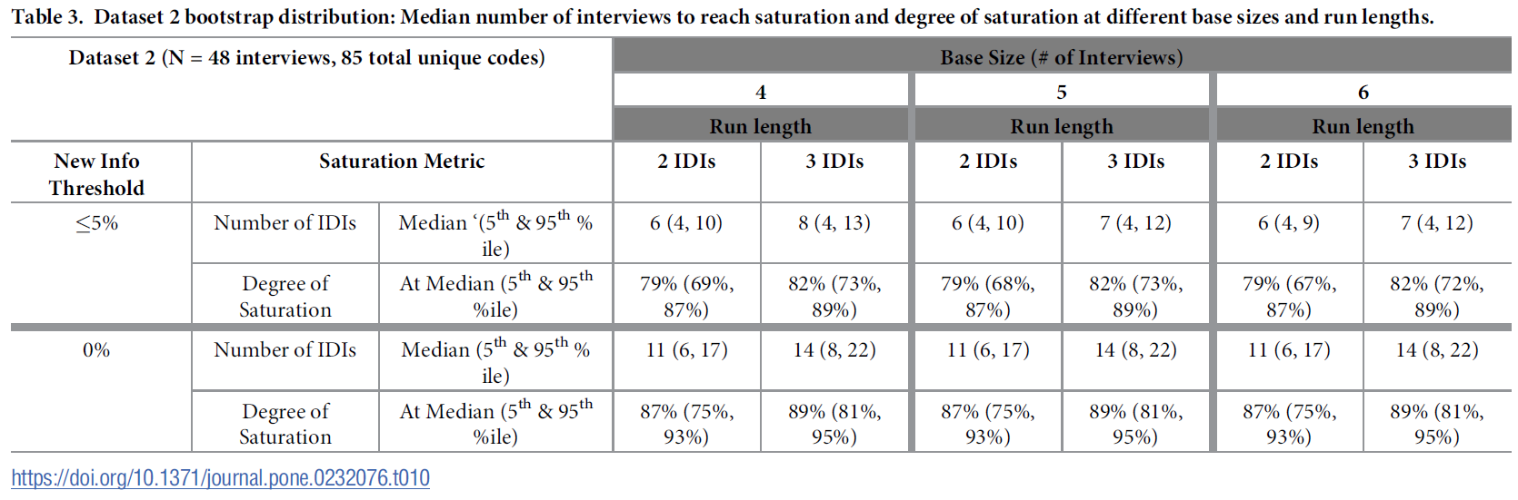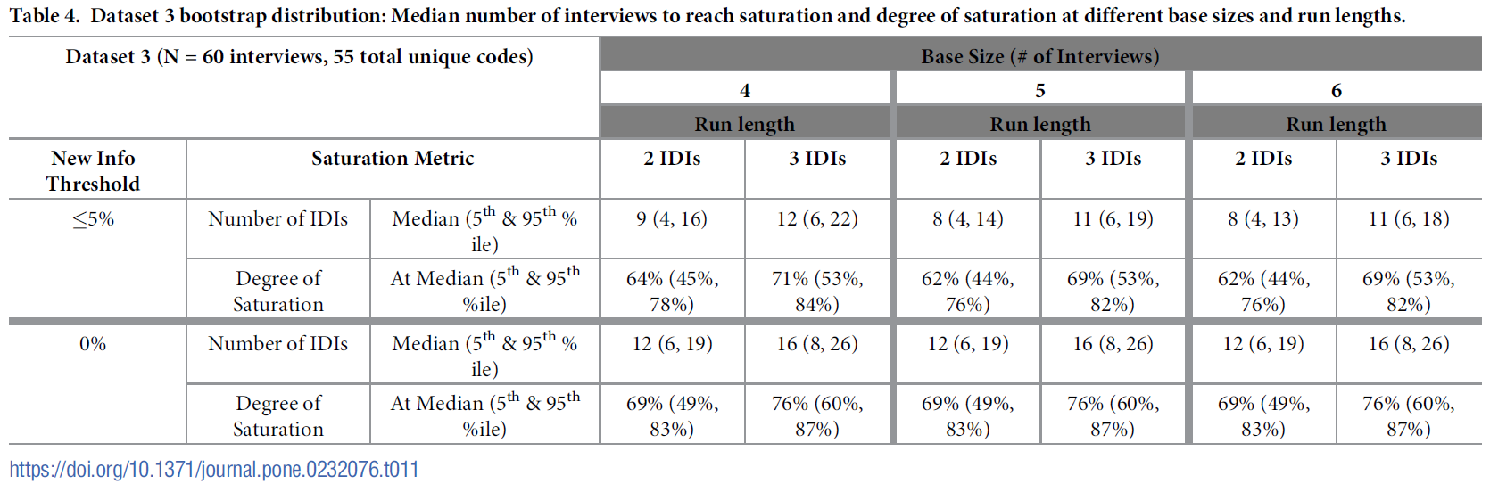 부트스트래핑 분석을 기반으로 몇 가지 결론을 도출할 수 있습니다. 첫 번째는 결과가 이전의 경험적 연구를 바탕으로 예상했던 범위 내에 있다는 것입니다. 5% 이하의 새로운 정보 임계값을 사용한 결과, 일반적으로 6~7개의 인터뷰로 균질한 표본에서 대부분의 주제를 포착할 수 있습니다(6개의 인터뷰로 80%의 포화에 도달). 또한 분석 결과, 이 옵션의 상위 범위(95번째 백분위수)에서는 11~12개의 인터뷰가 필요할 수 있으며, 기존 문헌에 따르면 일반적으로 더 높은 포화에 도달하기 위해서는 12개의 인터뷰가 필요하다고 합니다.