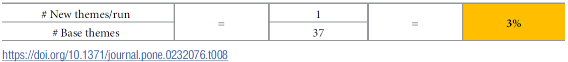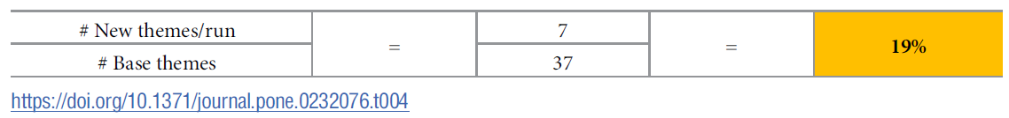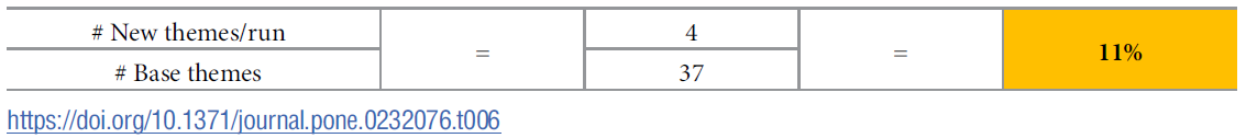 Take the number of new themes in the latest run (four) and divide by the number of themes in the base set (37). This renders a quotient of 11%, still not below our ≤5% threshold. We continue to the next run.