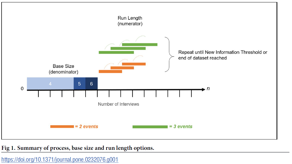 A run can be defined as a set of consecutive events or observations, in this case interviews. The run length is the number of interviews within which we look for, and calculate, new information. The number of new themes found in the run defines the numerator in the saturation ratio. Hagaman and Wutich (2017) and Francis et al. (2010), for example, consider runs of three data collection events each time they (re)assess the number of new themes for the numerator, whereas Coenen et al. (2012) include only two events in their data runs. For our analyses we provide both options for run lengths in our calculations–two events and three events–to afford researchers more flexibility. Note that in our analyses, successive runs overlap: each set of interviews shifts to the right or “forward” in time by one event. Fig 1 shows the process, and how base size and run length relate to one another. Here again the unit of analysis is the data collection event; the items of analysis are unique codes.