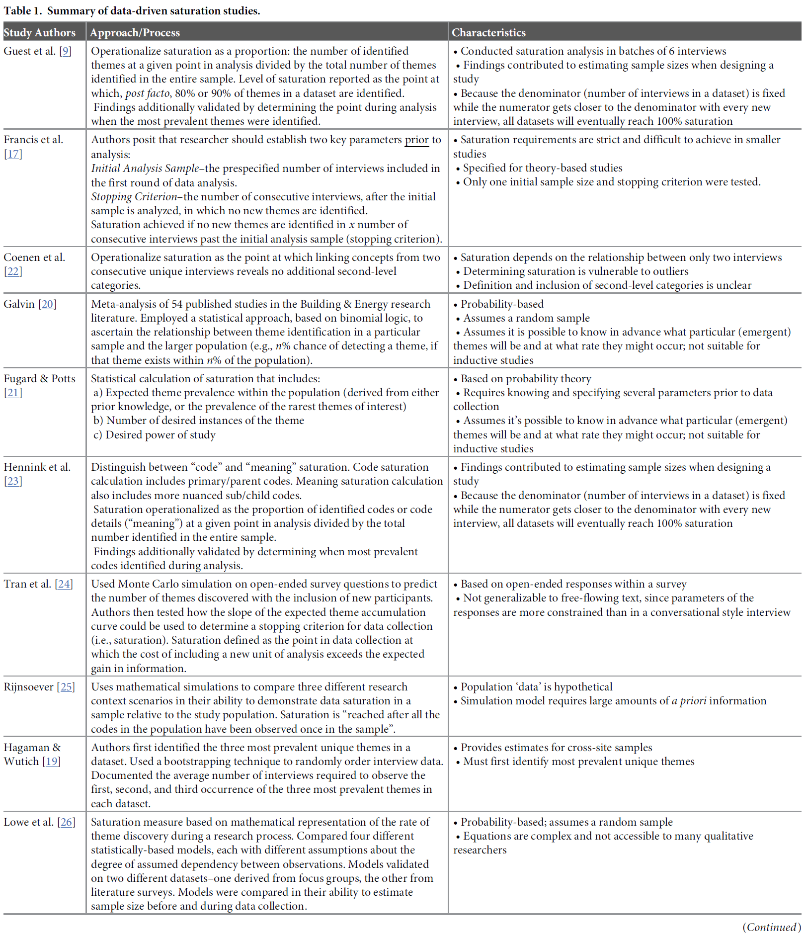 The range of empirical work on saturation in qualitative research and detail on the operationalization and assessment metrics used in data-driven studies that address saturation are summarized in Table 1. In reviewing these studies to inform the development of our approach to assessing saturation, we identified three limitations to the broad application of saturation assessment processes which we sought to overcome: