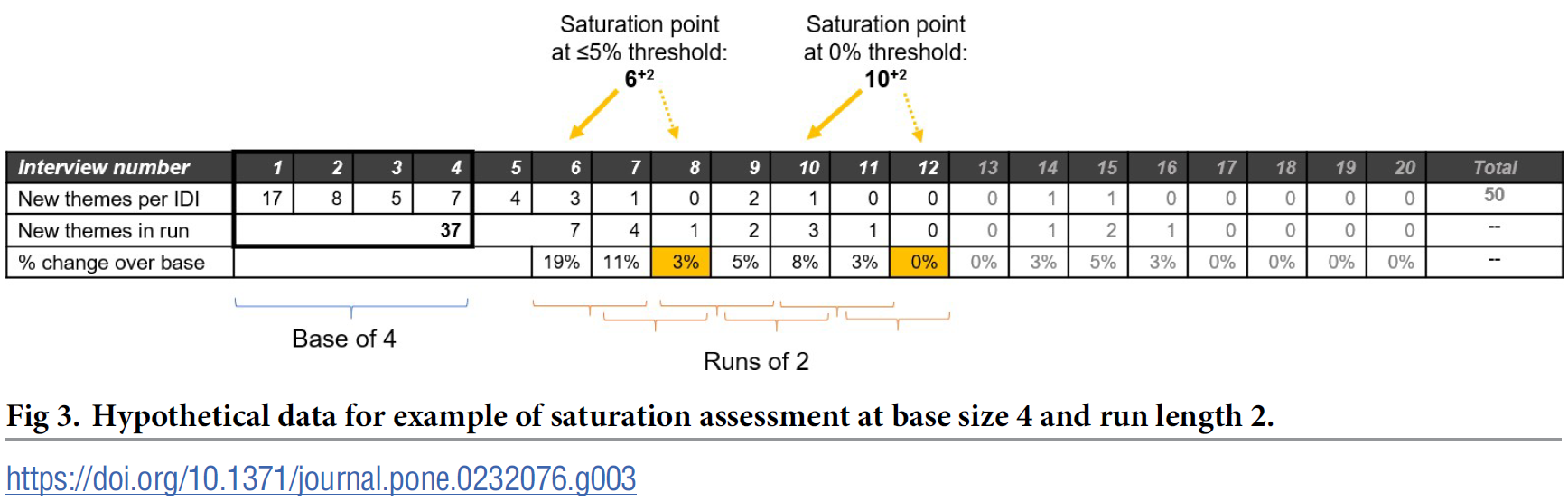 If we wanted to be more conservative, and confident in our conclusion of reaching saturation in this example, we could adjust two parameters of our assessment. We could increase the run length to 3 (or an even larger number), and/or we could set a more stringent new information threshold of no new information. If we consider the hypothetical data set used here (see Fig 3) and kept the run length of 2, the 0% new information threshold would have been reached at interview 10+2.