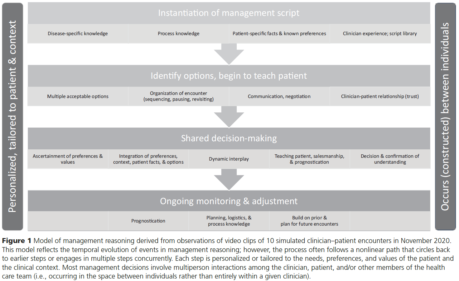 - We developed an empirical model of management reasoning composed of 4 steps of temporal evolution (script instantiation, identifying options and teaching patients, shared decision making, and ongoing monitoring and adjustment) and overarching features of personalization and occurrence between individuals.