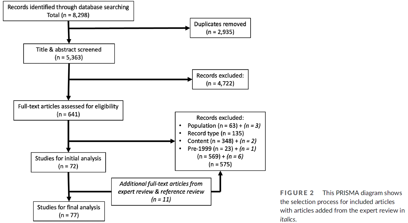 The literature search yielded 5363 articles from the five different databases, after removing duplicates. Through iterative reviews of the abstracts and full text articles, we identified 72 articles for inclusion, which increased to 77 articles after we added five articles that we found during reference hand searching and via feedback from our expert consultants (Figure 2).