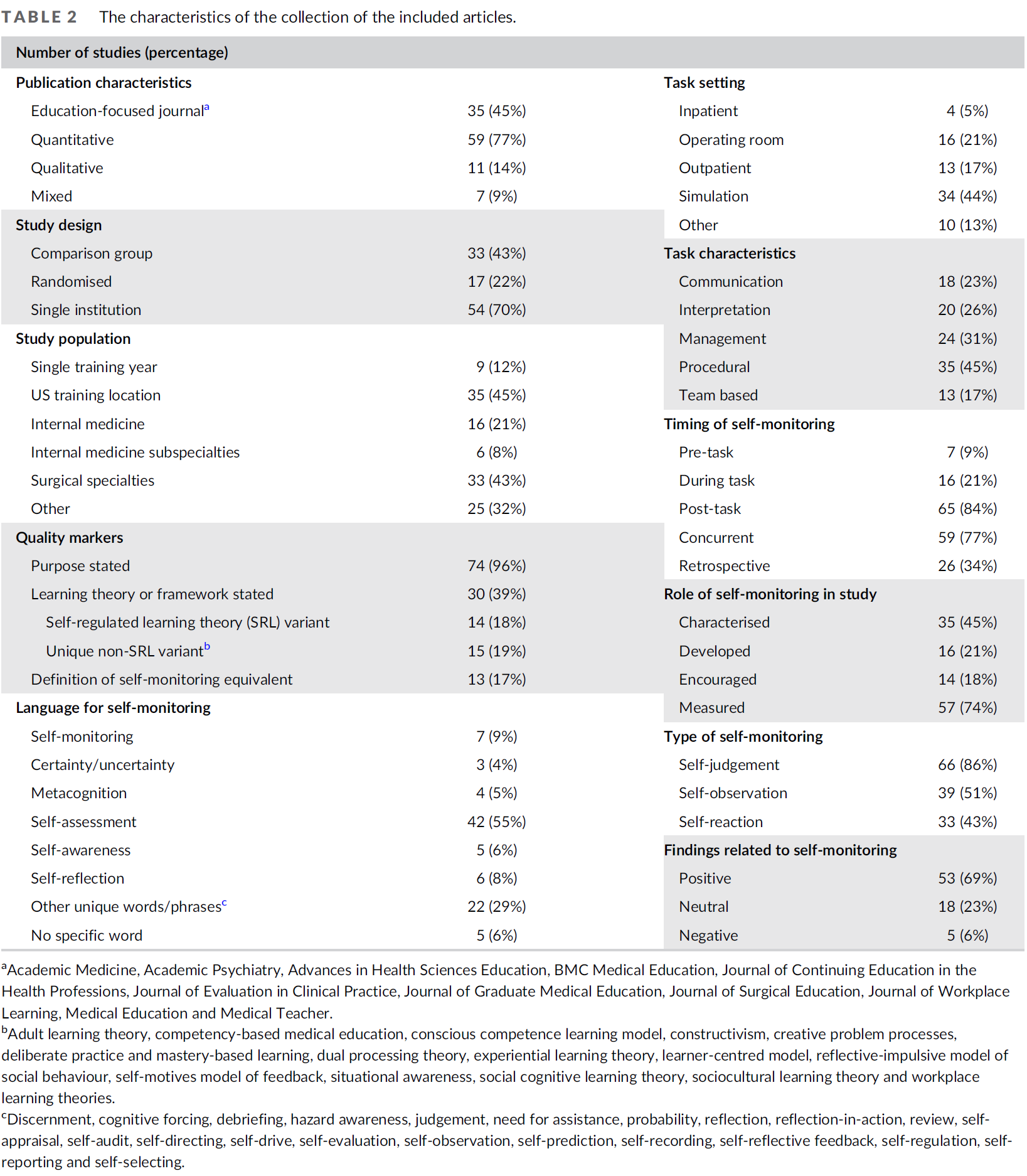 We charted the data using a coding sheet that we developed iteratively by preliminary coding a subset of included articles and group discussions among the co-authors, grounded in a social cognitive theory of SRL theory and, specifically, self-monitoring. We applied the final coding sheet to each included article (Data S2). Given the heterogeneity of types of articles, we assessed the quality of each study using two different, well-studied quality metrics—the Medical Education Research Study Quality Instrument and Standards for Reporting Qualitative Research.26, 27 Quantitative studies were evaluated with the Medical Education Research Study Quality Instrument, qualitative studies with the Standards for Reporting Qualitative Research and mixed methods studies with both. Given that not all fields were relevant for each study, we decided to report quality scores as a percentage of the maximum possible points an article could receive based on the applicable fields. One author (WRJ) coded each article. A second author (AMB, ARA or SJD) reviewed each article and assigned coding. Any discrepancies were resolved through discussion with a minimum of three authors present (ARA, SJD and WRJ).