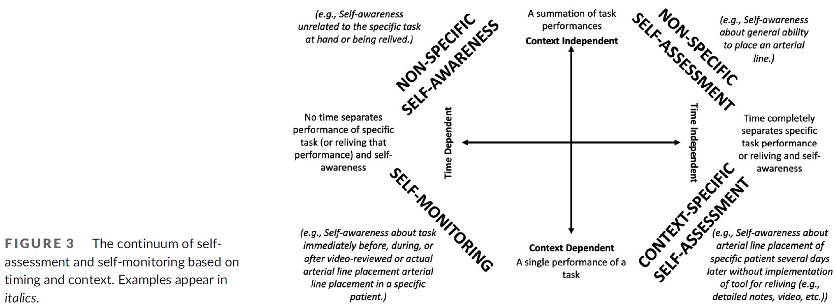 Self-monitoring is an in-the-moment self-awareness of one's performance and offers a promising alternative to self-assessment.8, 9 Unlike self-assessment, which is a global phenomenon, self-monitoring focuses on a specific task at a specific moment in time. For example, if a trainee was asked to globally assess their ability to insert an arterial line in a critically ill patient, he/she would likely provide an inaccurate assessment of their capabilities. On the other hand, research suggests that undergraduate medical education trainees can accurately self-monitor.8, 9 In other words, a trainee can accurately evaluate their performance of an arterial line placement in Ms. Jones, a 72-year-old critically ill patient, immediately before, during or after completing it at 0115 during a shift in the intensive care unit.