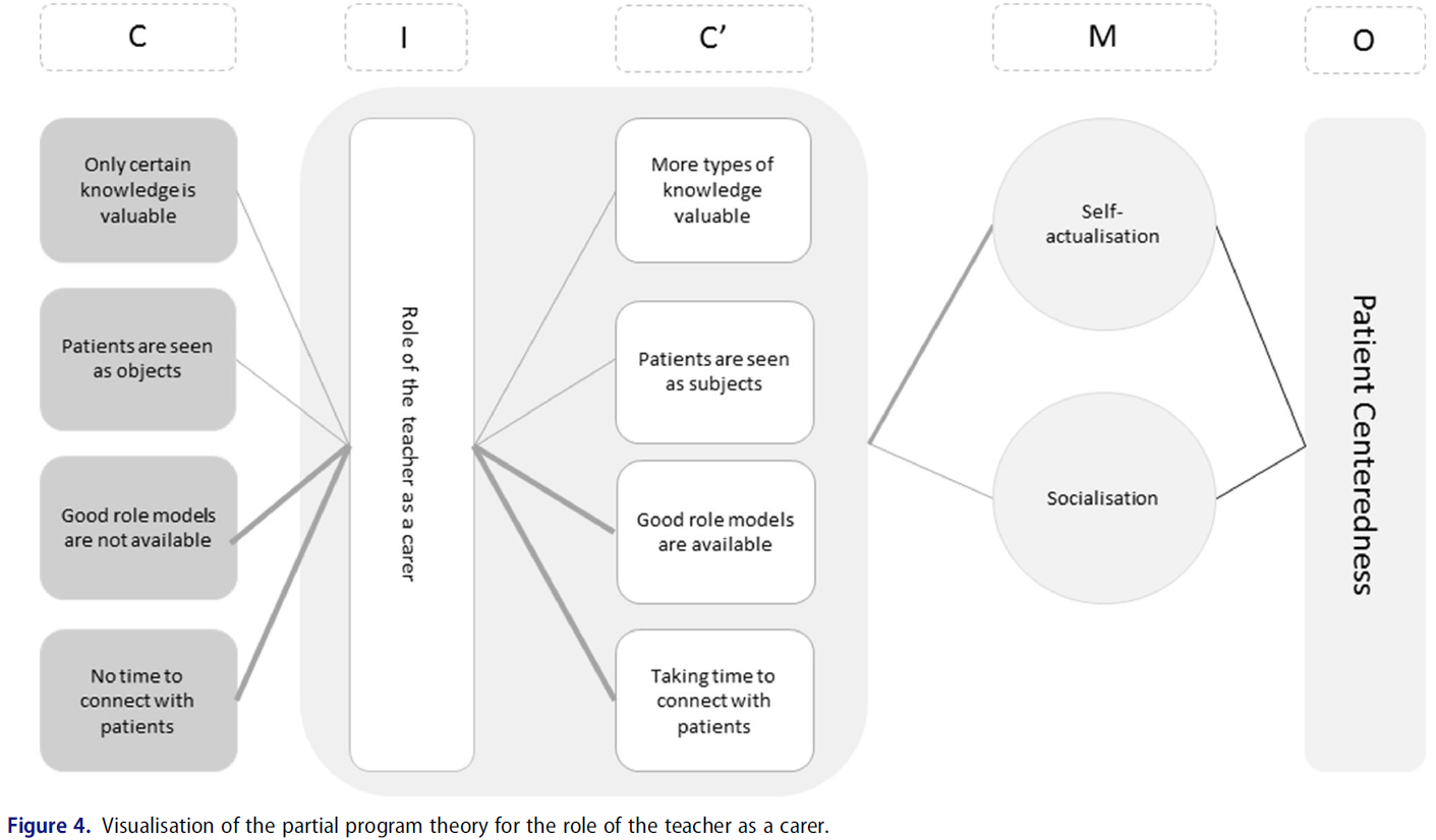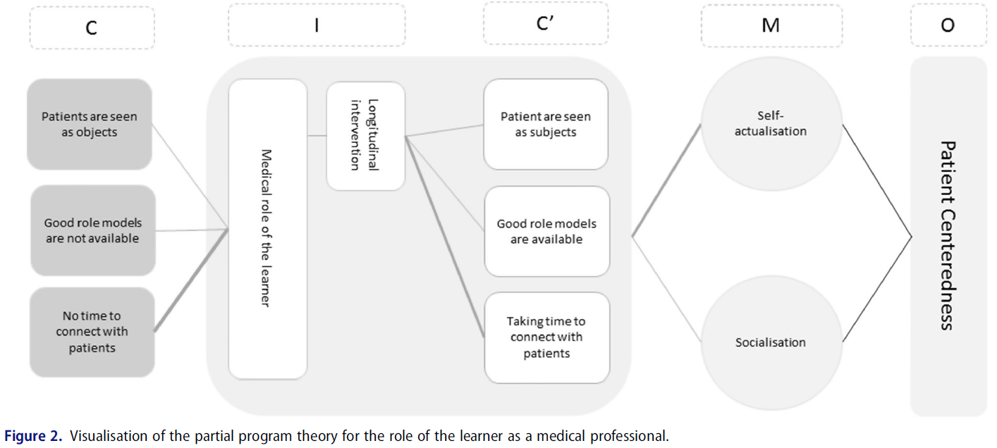 Developing a program theory, composed of three partial program theories, based on a heterogenic set of interventions, asks for compromises. To be able to establish configurations, mentioned above, we have chosen to split up the intervention components and the contexts. In practice, the components and contexts will interact. For example, the role of a learner as a medical professional interacts with what teachers do as role models, which is shown in the background paper by Branch where a caring teacher helps the learner and gives responsibility in the patients’ care: