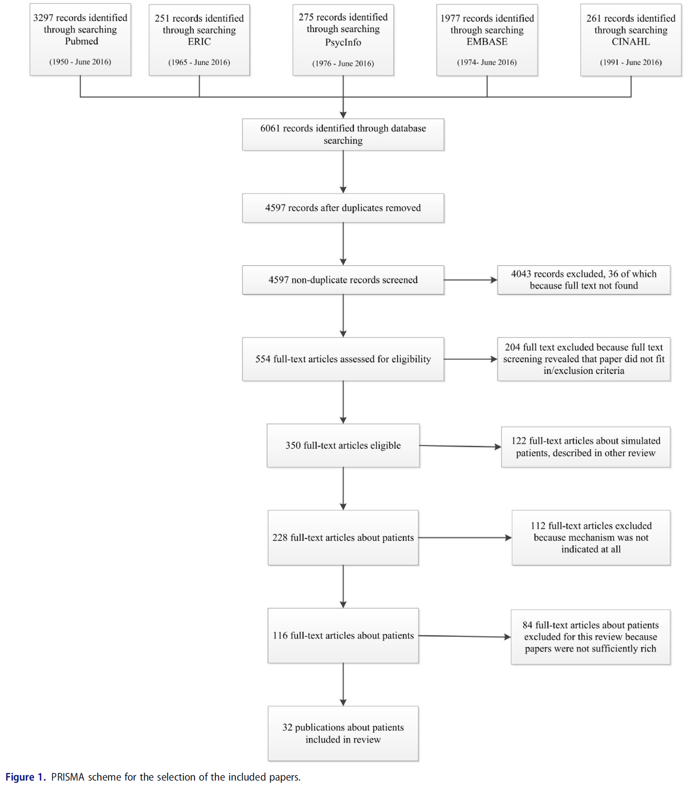 The search strategy and the assessment for eligibility resulted in a set of 32 articles that were included in this review. For reasons of readability, the PRISMA scheme is included as Figure 1 in Supplementary Appendix 3. In Supplementary Appendix 5, an overview is presented of the studies included. Most studies were performed in hospital settings in North America. The majority of papers were about students, not residents or professionals, and 25 out of the 32 papers had a qualitative design.